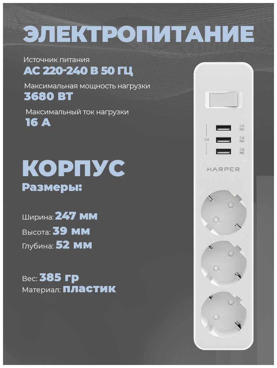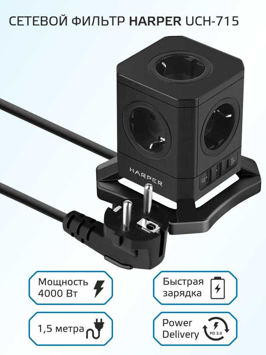 8.3/10 балловHARPER UCH-730 [5 розеток, 2 USB + 1 Type-C PD, кабель 3 м, 4000 Вт, 16A]
