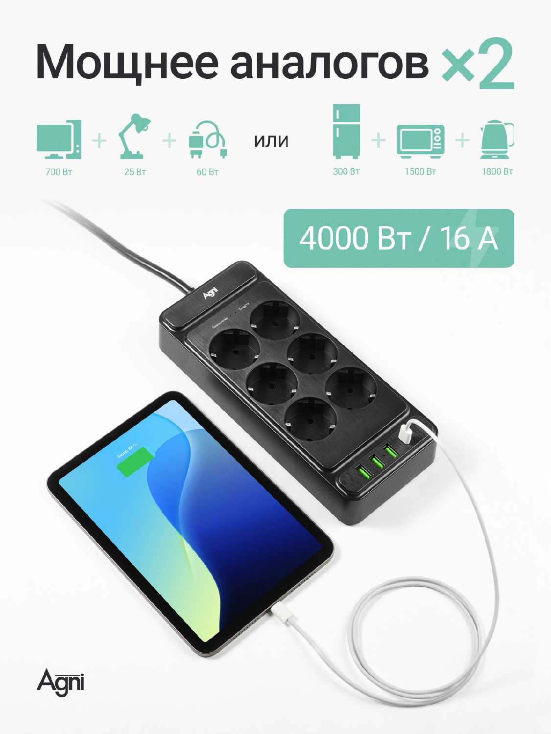 8.6/10 балловAGNI 5 розеток с USB (2 порта, один Type-C) [4000 Вт / 16 А, кабель 3 м]