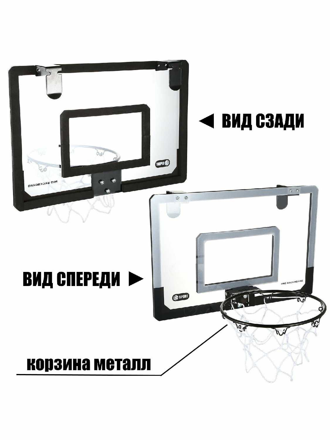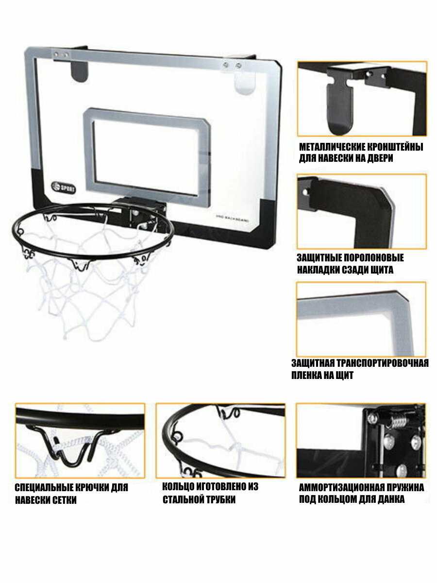 Подробная комплектация : | кольцо баскетбольное - 1 шт, сетка для баскетбольного кольца - 1 шт, щит баскетбольный прозрачный - 1 шт, металлические кронштейны для подвеса - 2 шт, комплект крепежа 1 шт, мяч баскетбольный 16 см - 1 шт, насос для мяча - 1 шт, крючки для подвеса щита - 2 шт. |