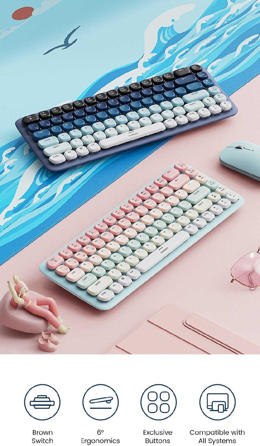 - Компактный форм-фактор 65% (30×15 см) оптимизирован под мобильное использование, сохраняя функциональные клавиши Home, PgUp/Dn.