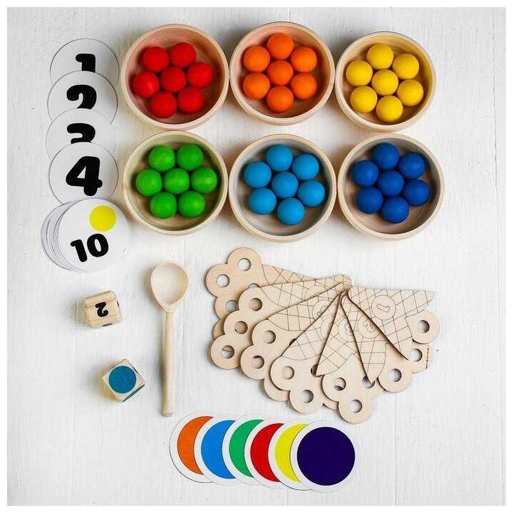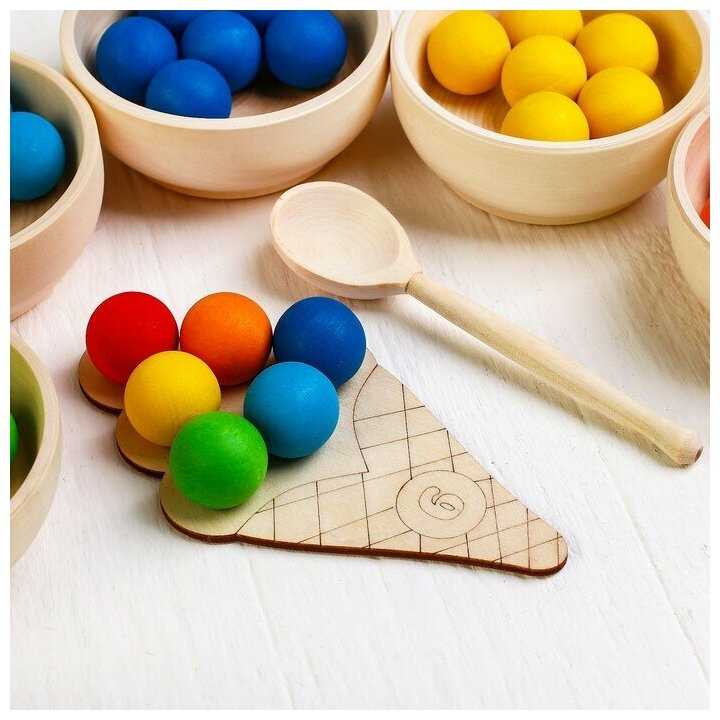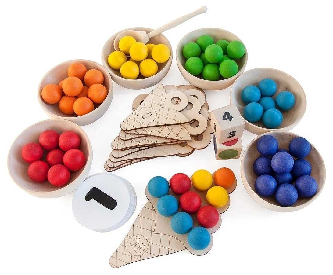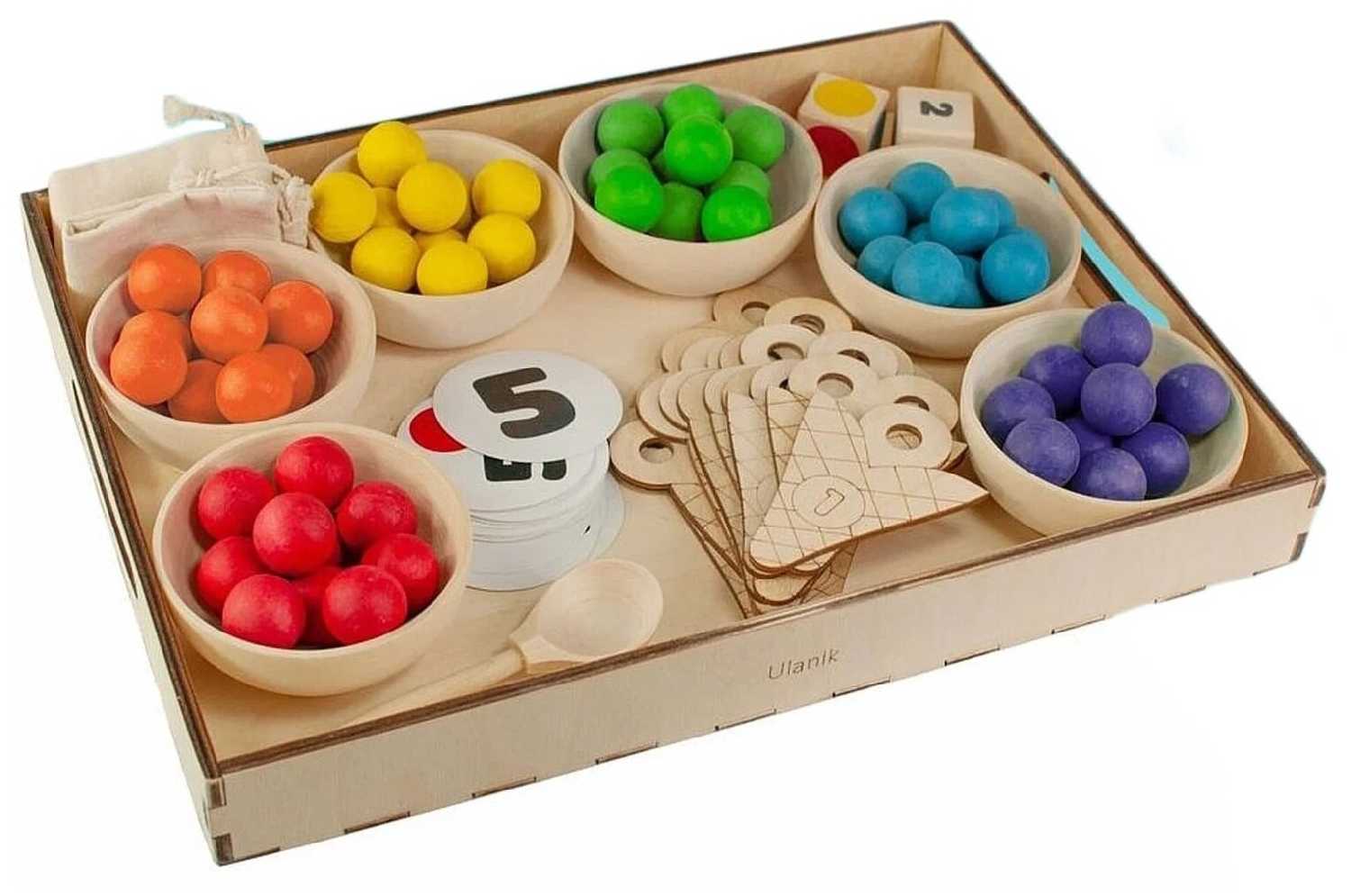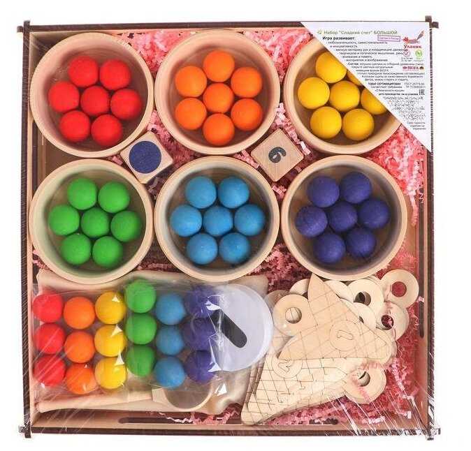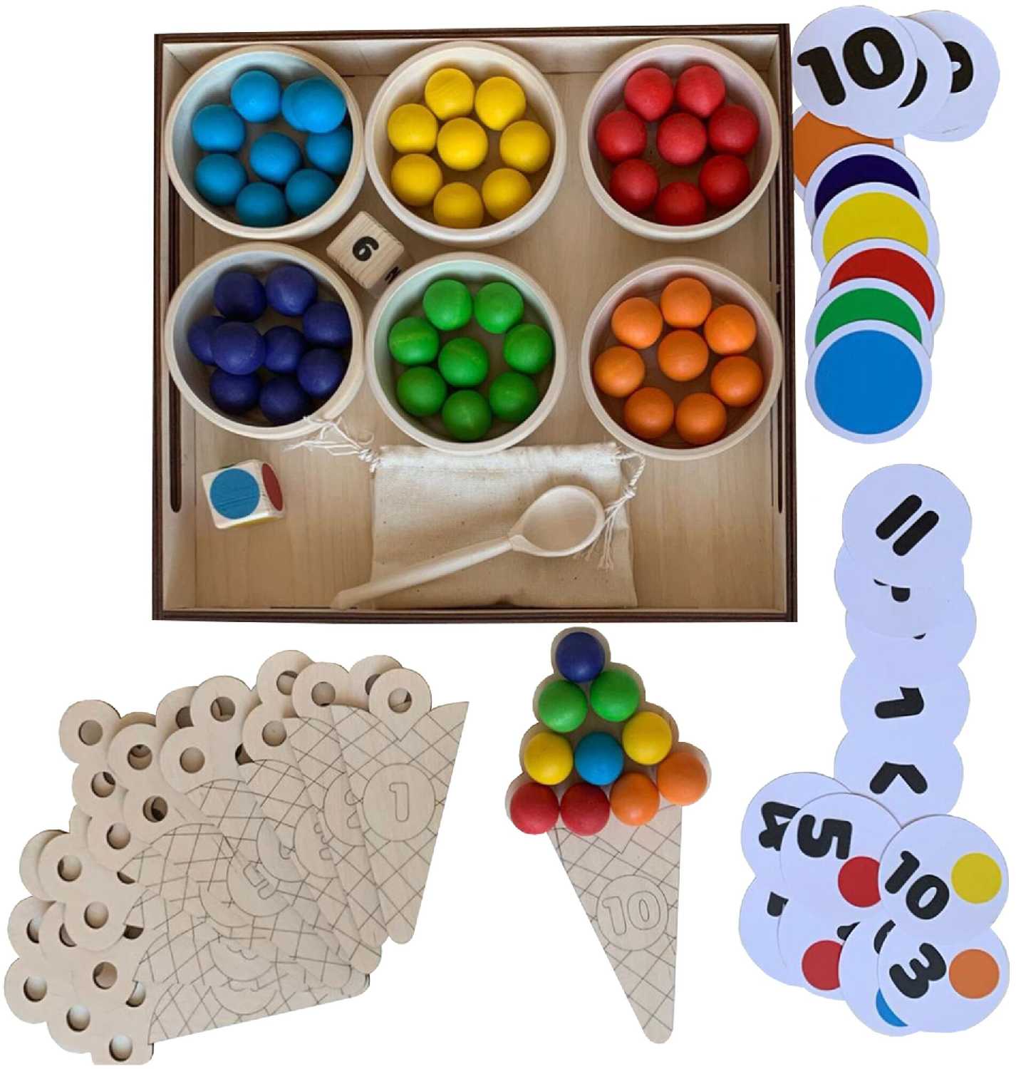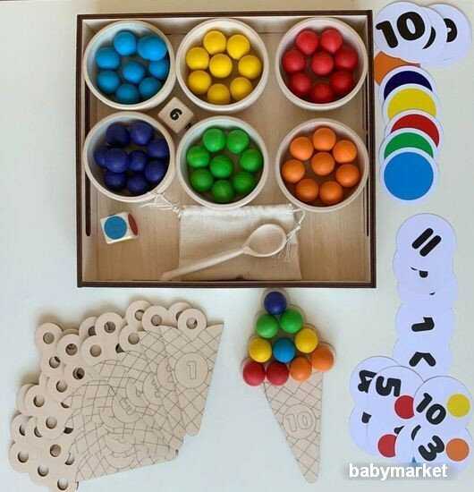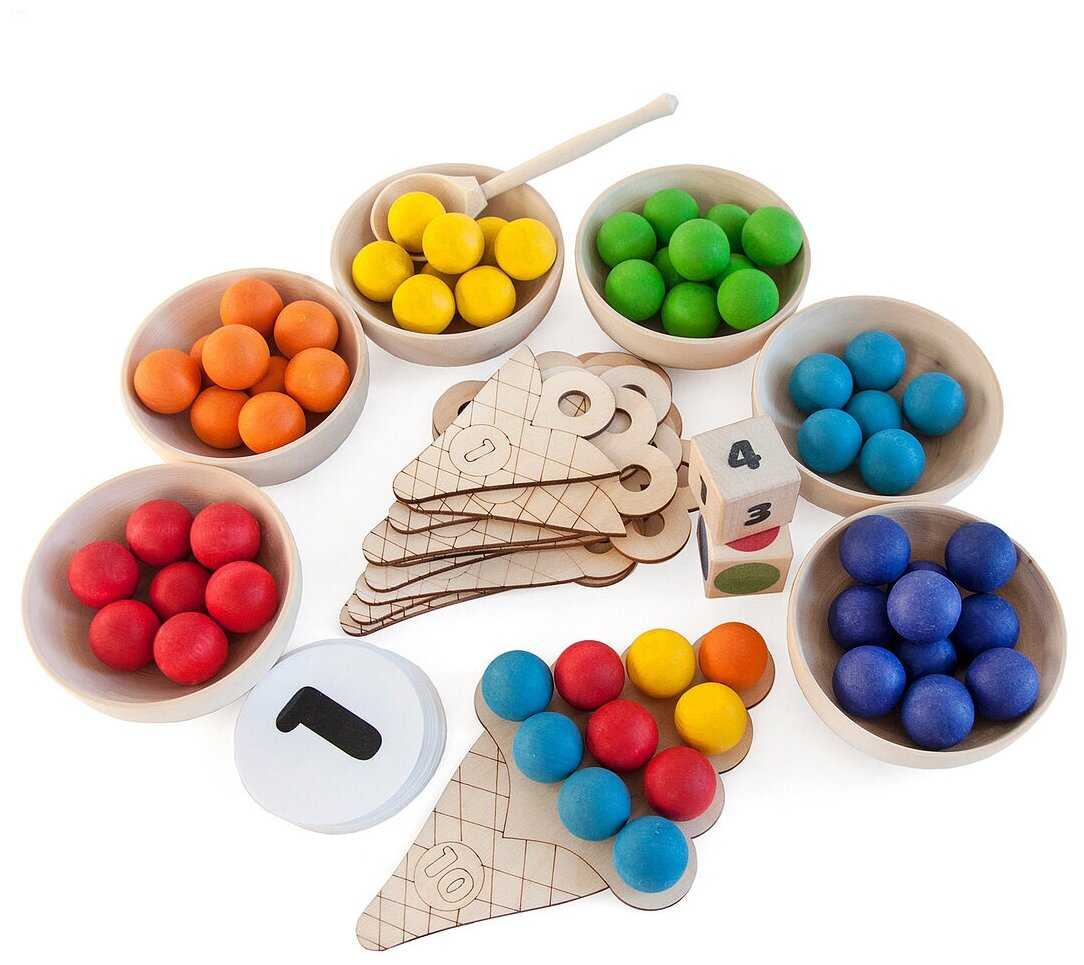 Комплектация : | 60 шариков шести цветов, 6 деревянных пиал, 10 деревянных рожков мороженого с цифрами, 2 деревянных кубика с цветами и с цифрами, 6 карточек с 6 цветами, карточки с цифрами (от 0 до 10), карточки со знаками (+, -, >, <, =), 6 карточек с заданиями по количеству и цвету, деревянная ложка, льняной мешочек, деревянный поднос |