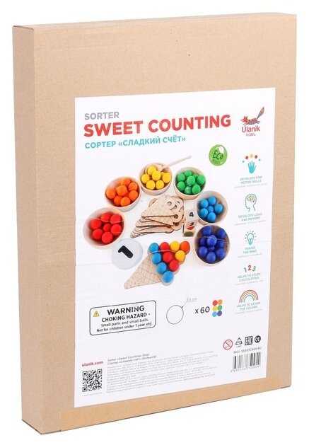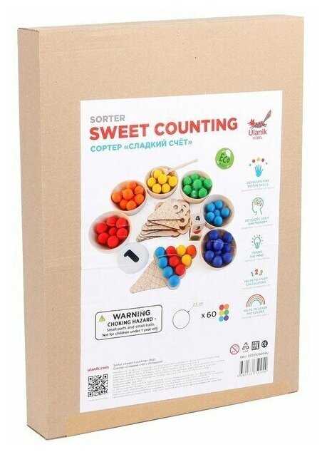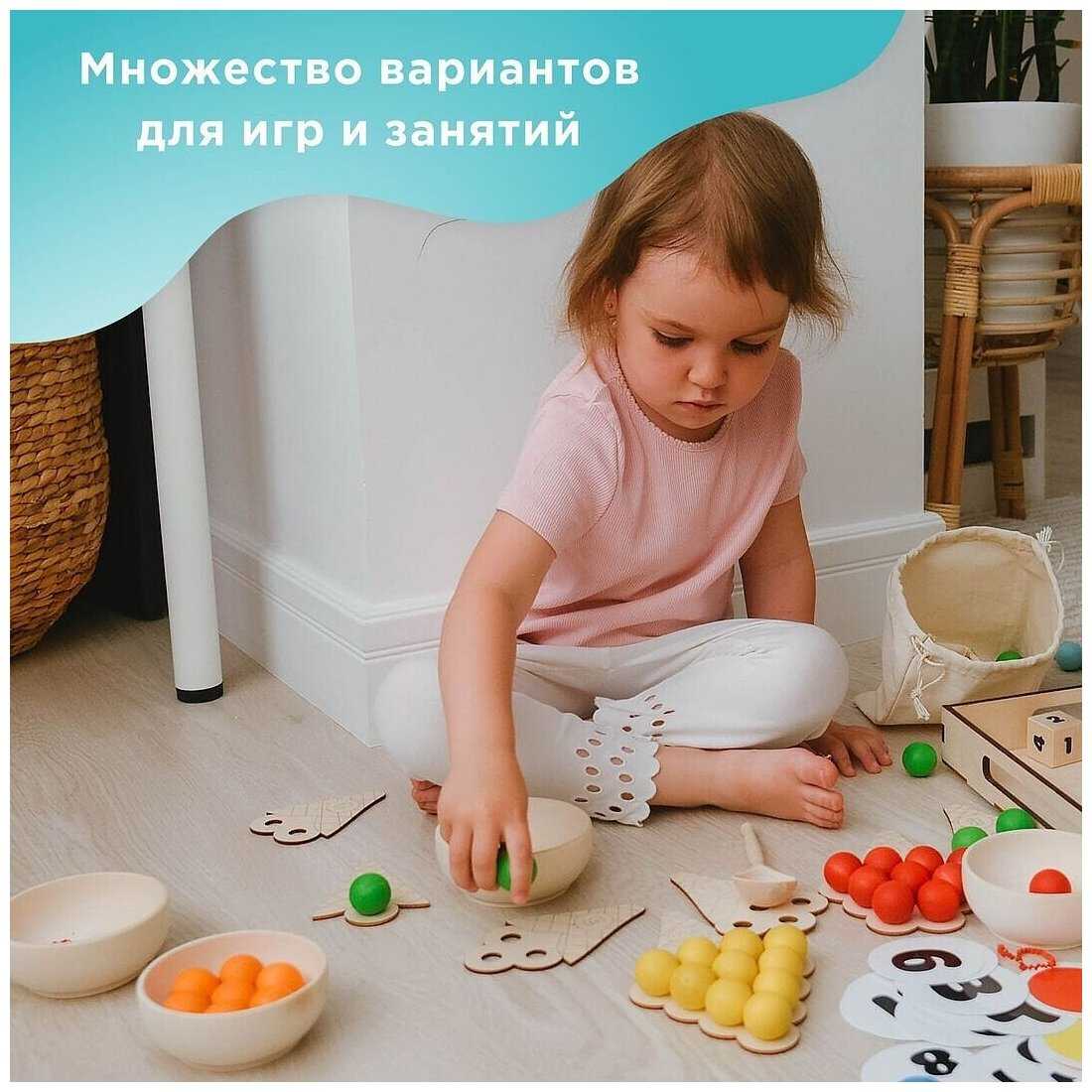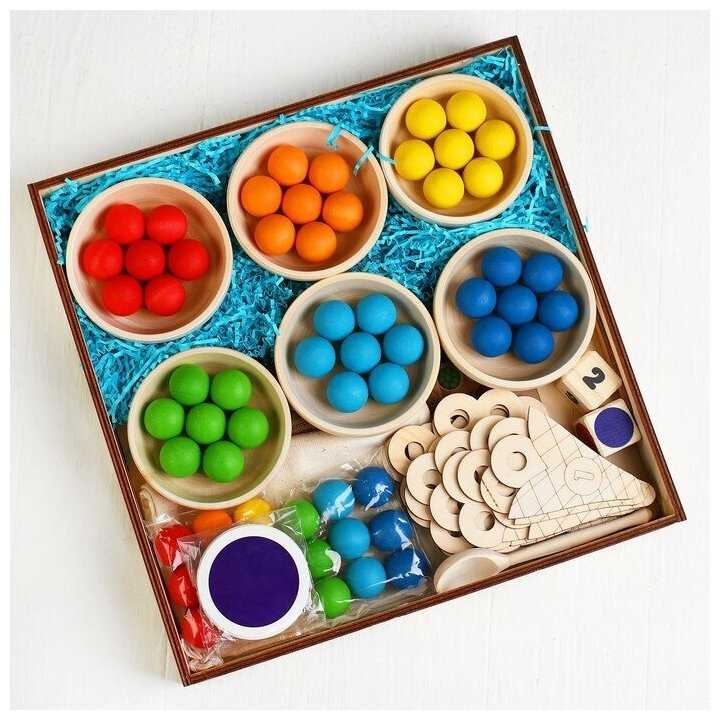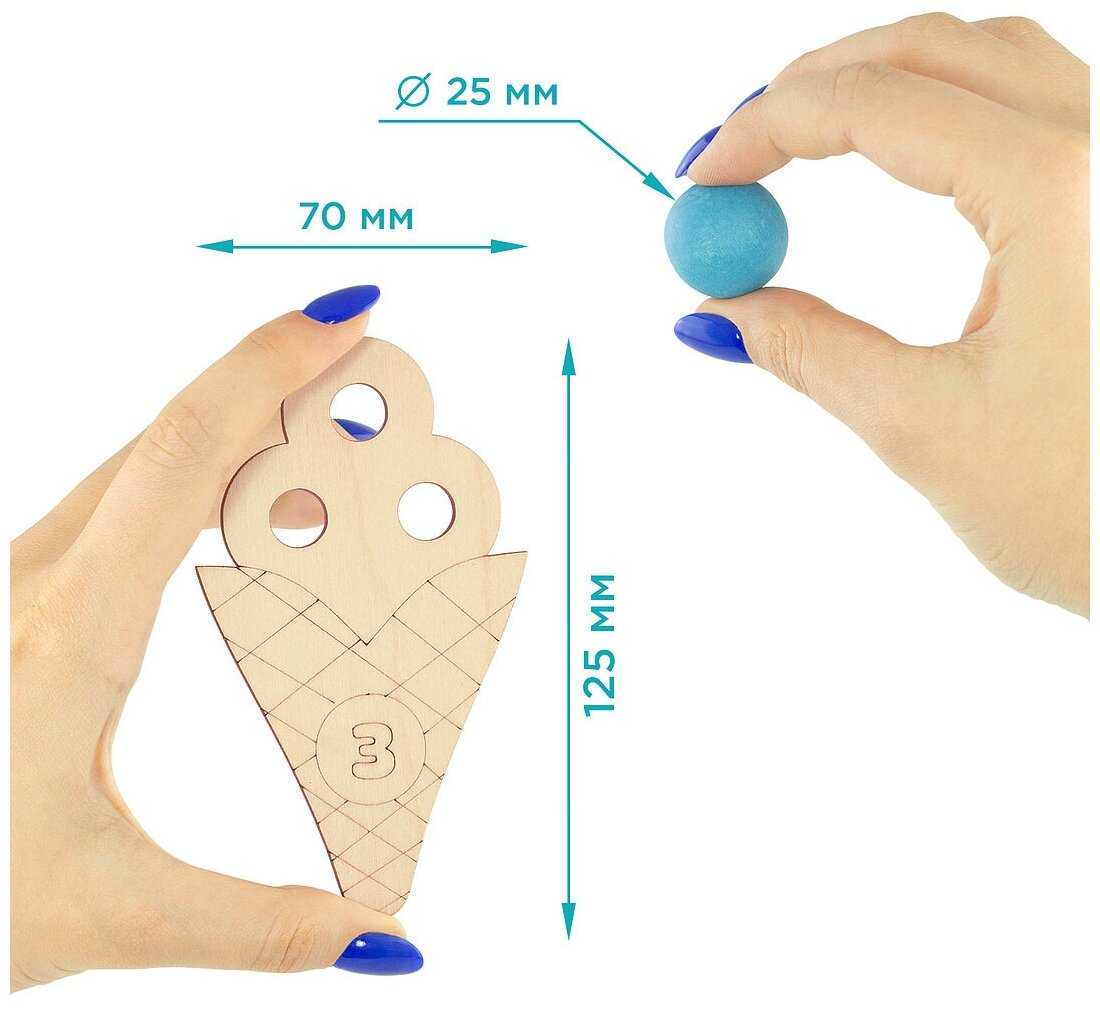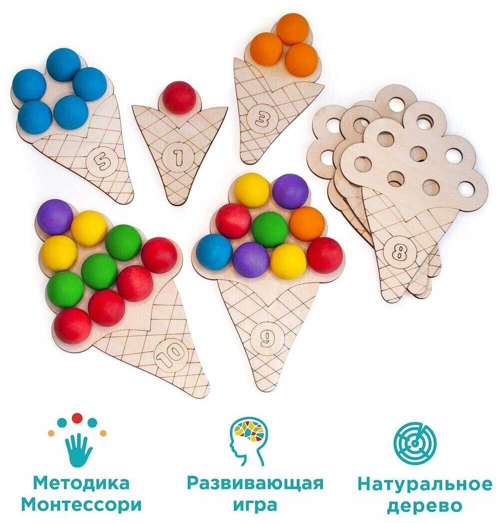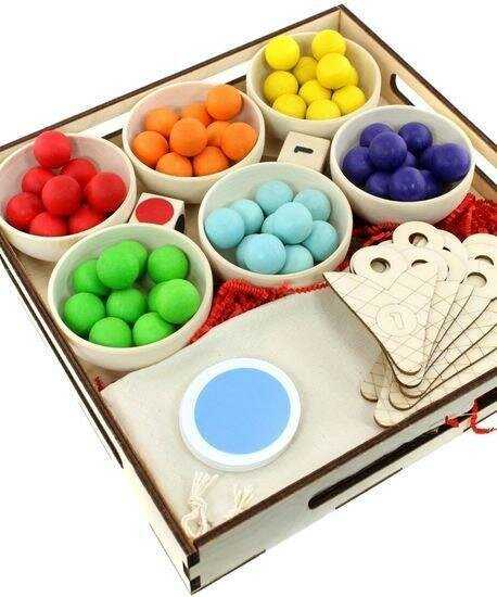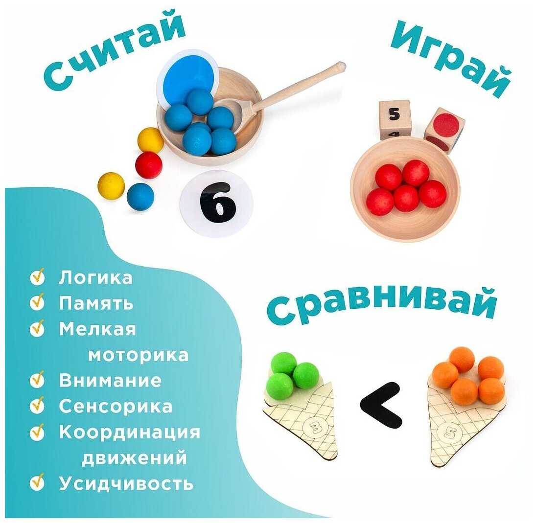 Комплектация : | 60 шариков шести цветов, 6 деревянных пиал, 10 деревянных рожков мороженого с цифрами, 2 деревянных кубика с цветами и с цифрами, 6 карточек с 6 цветами, карточки с цифрами (от 0 до 10), карточки со знаками (+, -, >, <, =), 6 карточек с заданиями по количеству и цвету, деревянная ложка, льняной мешочек, деревянный поднос |