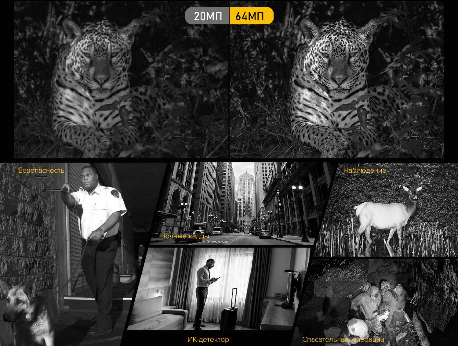 - Ночной режим с ИК-подсветкой позволяет идентифицировать объекты на расстоянии 15+ метров в полной темноте.