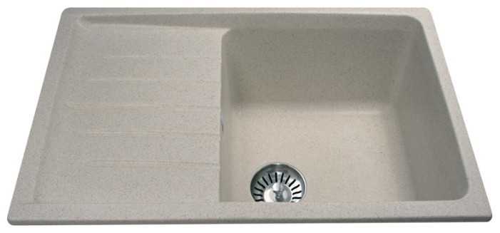 - + Большая чаша мойки, искусственный мрамор - вода не барабанит, легко моется, сливное отверстие с фильтром и затычкой.