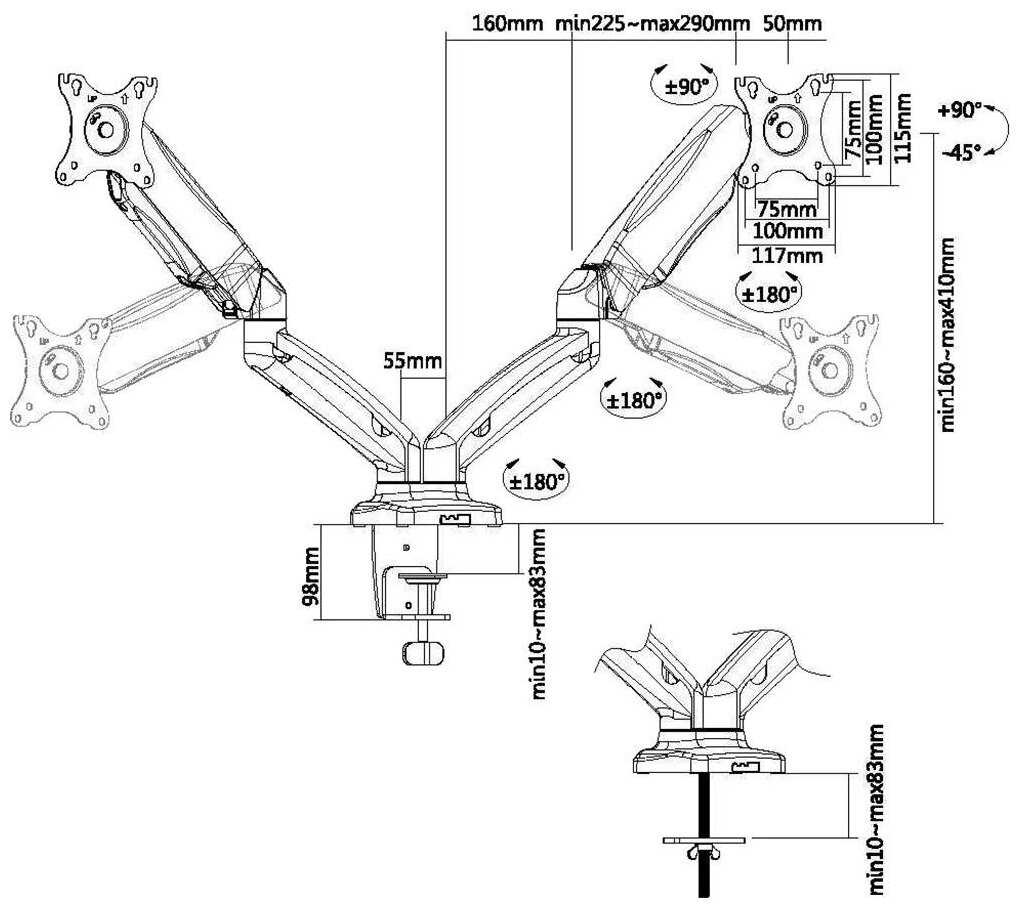 Сами крепления мониторов крутятся во все стороны. - - Советую пощупать вживую перед покупкой, т.к. далеко не все положения можно настроить и кронштейн из-за этого может не подойти. Два 24" монитора вплотную под широким углом нормально не поставить из-за конструкции кронштейна, или придётся оставлять сзади порядка 40см пустого места. У меня стол стоит у стены и это не очень удобно, Сжирается 20см от стола и ещё на 20см его надо отодвинуть от стены.