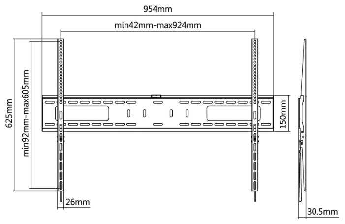 Приобретался для Самсунг 85" под размерность 600х400мм. От стены реально 3 см, пришлось повозиться с кабель-менеджментом, чтобы спрятать провода и навесить ТВ. Результатом доволен.