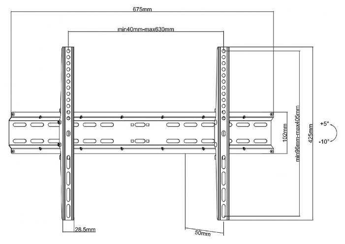 Кронштейн имеет регулировку угла 5 градусов вверх и 10 градусов вниз. Возможно я не разобрался, но в определенном положении для телевизора 65 дюймов нужная фиксация не происходит. Напишите в комментариях, может я что-то не понял ) Возможно, нужно подтянуть гайки вертикальных планок, но после одного-двух измен