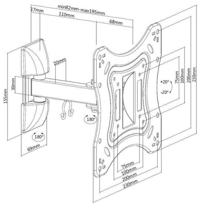 - + Регулировка, угол регулировки, расстояние между креплением к стене и креплением к телевизору.
