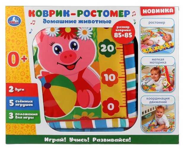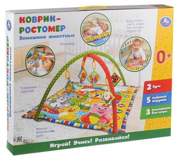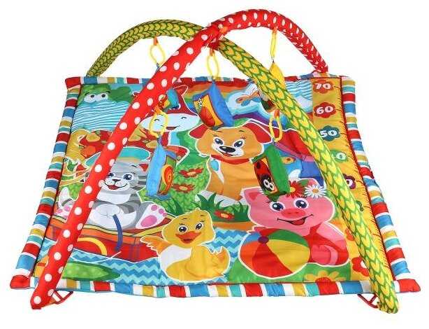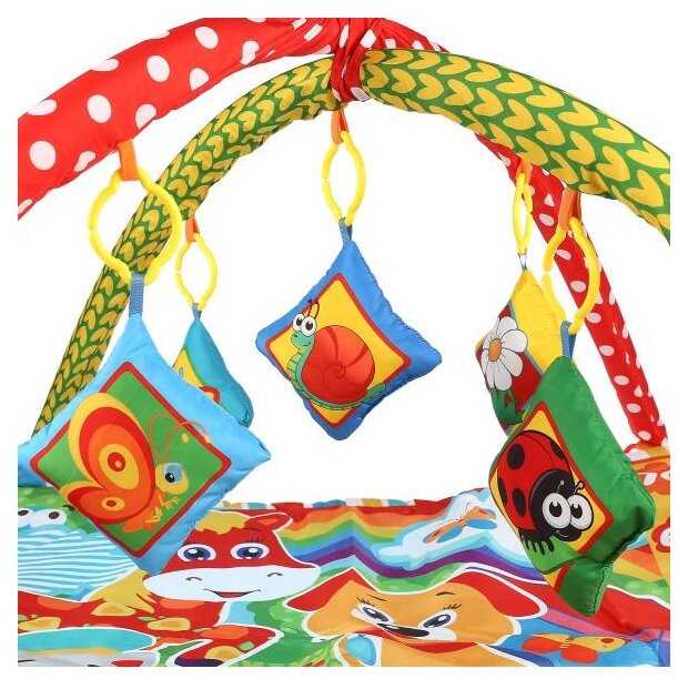 - + Яркий, лёгкий, собирается за минуту,можно заменять игрушки на более интересные. Внутри подвесов есть пищалки. Низ коврика сделан из плотного спанбонда,
