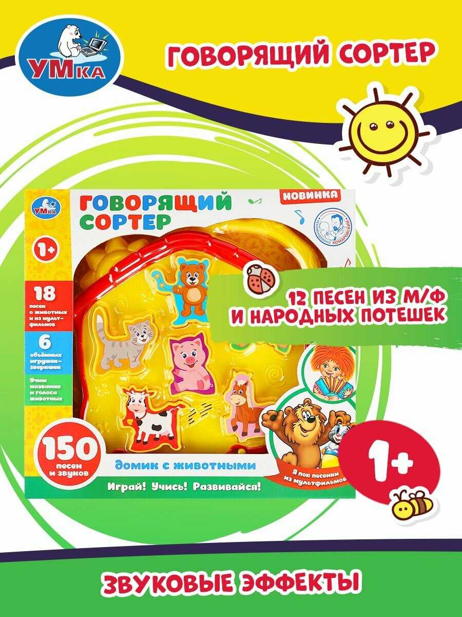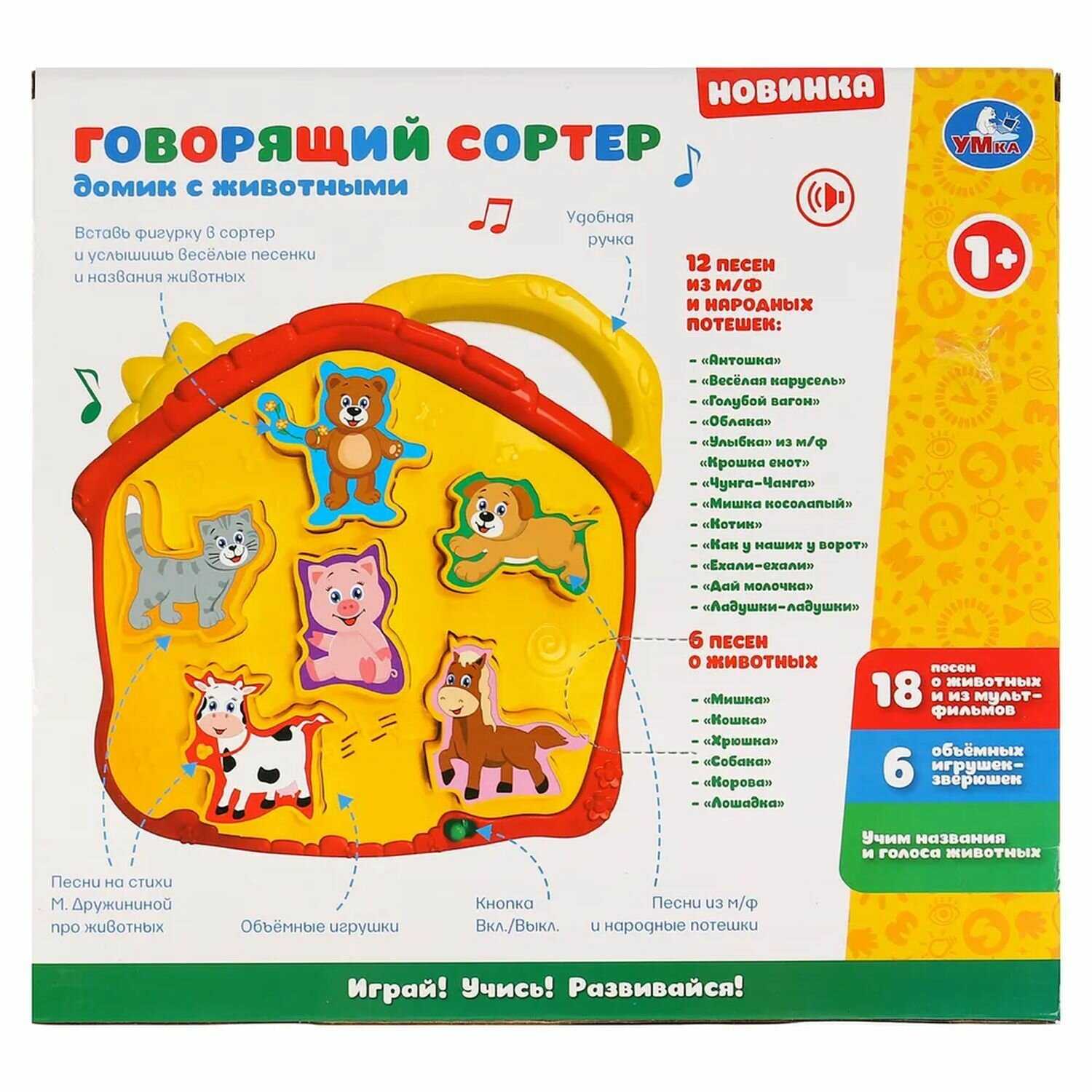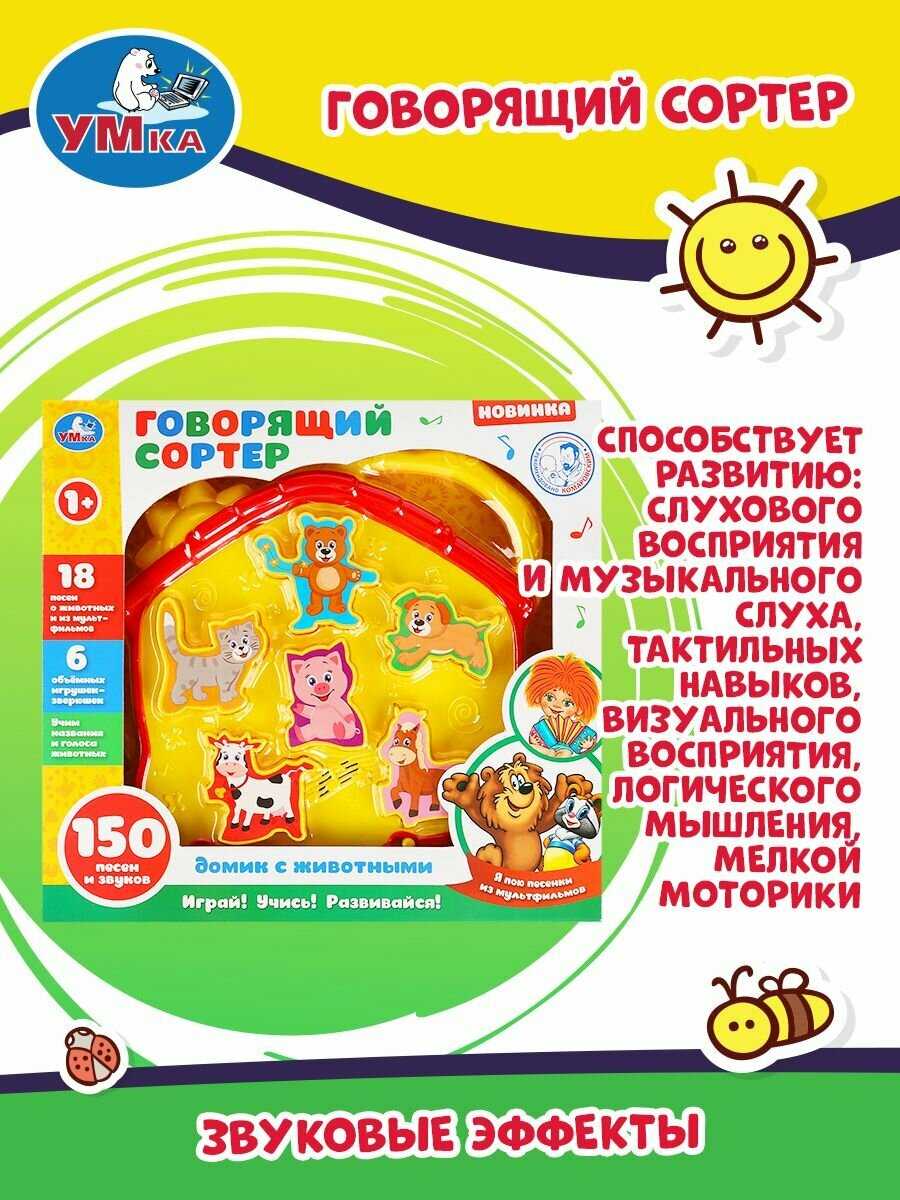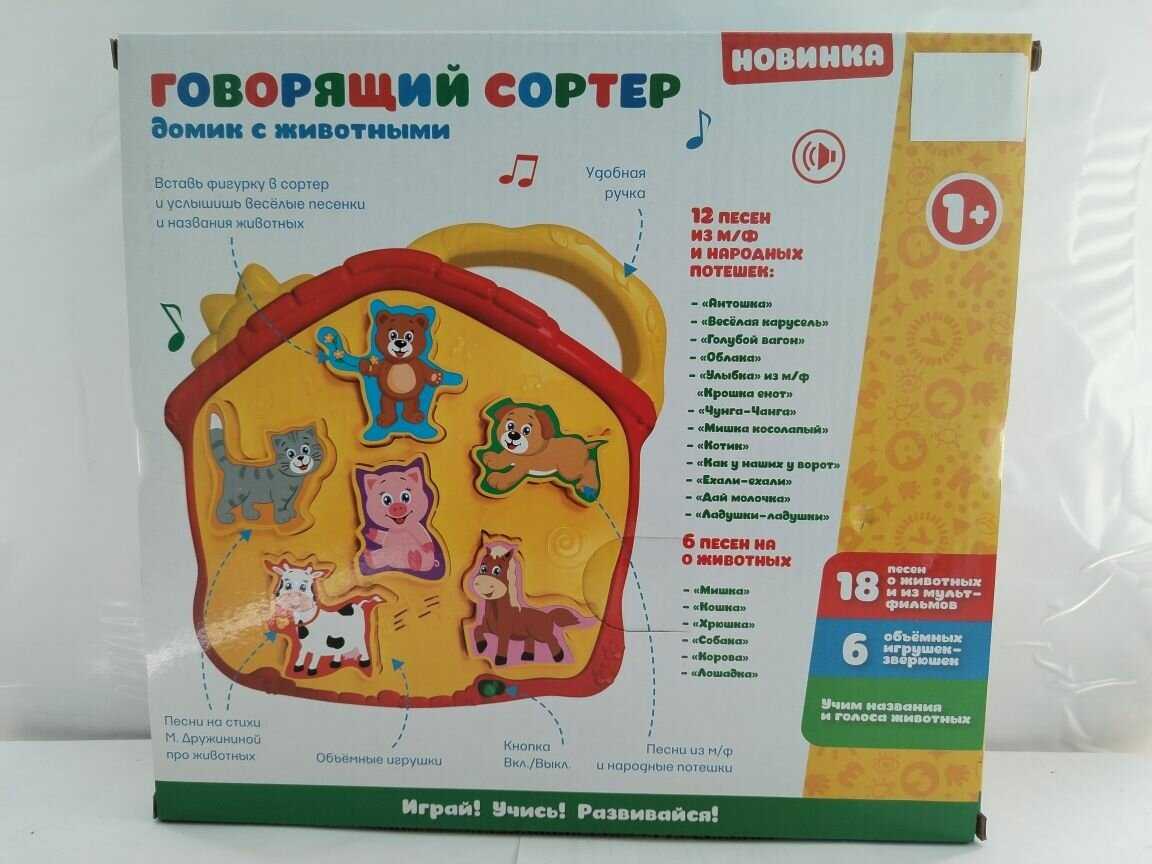 Комплектация : | Домик с животными» ТМ «УМка» – сразу 7 в 1: - Играем: 6 объёмных игрушек-зверюшек - Смотрим: игрушка с яркими крупными деталями - Учим: названия и голоса животных! - Расширяем словарный запас и кругозор - Заучиваем наизусть и слушаем: 18 лучших детских песни о животных - Все 150 загадок, потешек и звуков - для вас и малыша! |