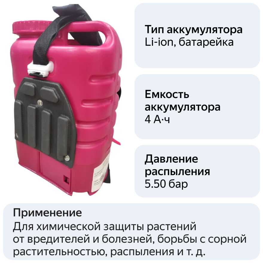Для ежедневной интенсивной эксплуатации опрыскиватель не подходит из-за ограниченного ресурса пластиковых деталей. Он оптимален для сезонных работ 3–4 раза в год на дачных участках до 20 соток. При этом литий-ионный аккумулятор 4.4 А·ч обеспечивает достаточную мобильность.