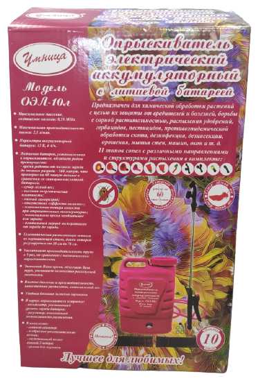 - + Литиевая батарея 4а/ч, легкий, 10литров удобно разводить препараты, много насадок