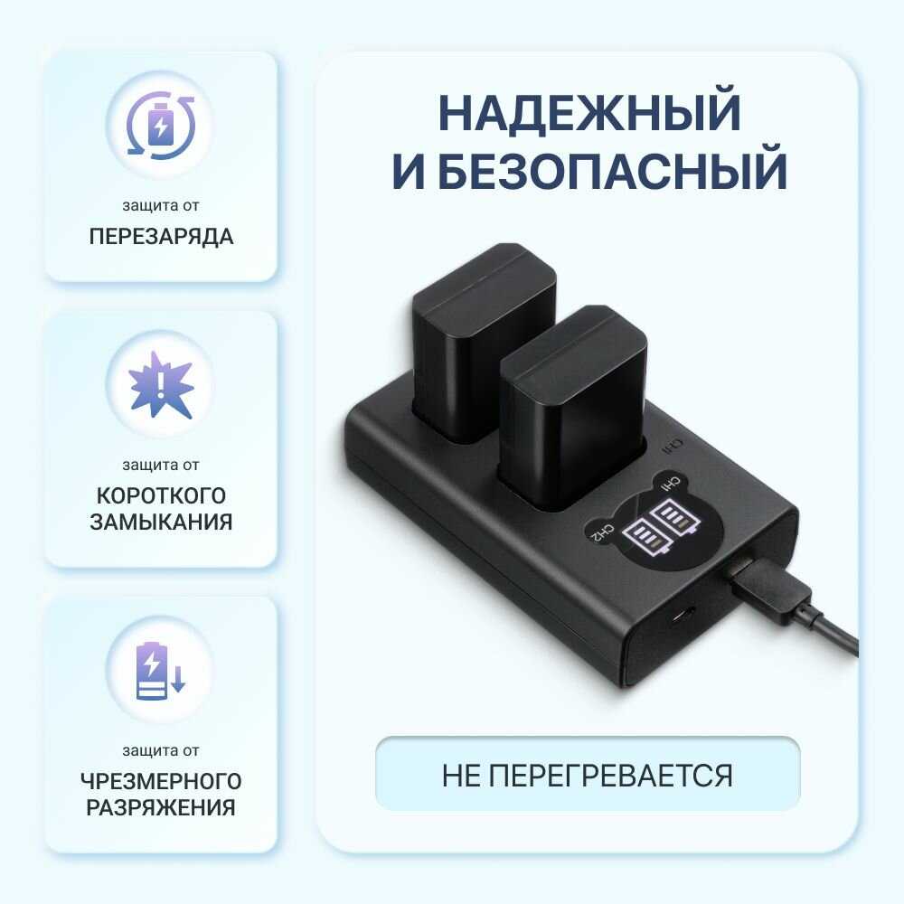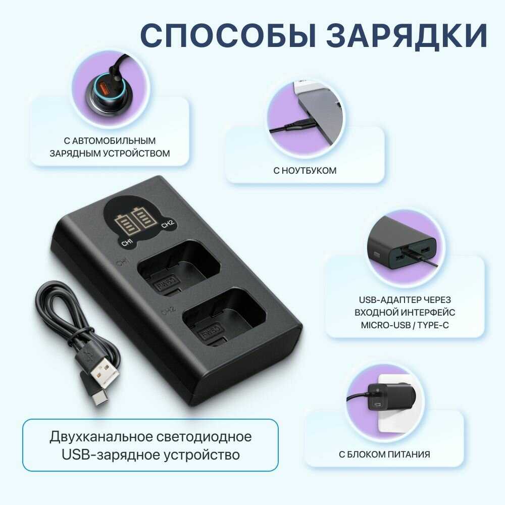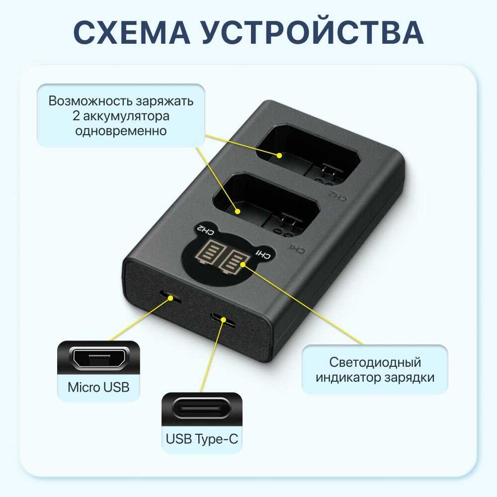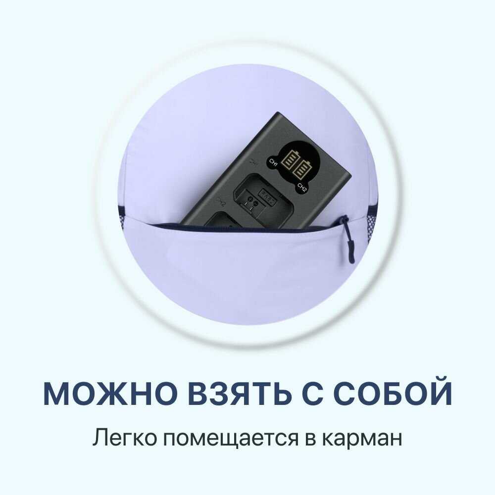 очень компактное зарядное устройство на две батареи (моë предыдущее на одну батарею было больше). пока использовала один раз, всё в порядке, время зарядки не засекала, но вроде довольно быстро. в комплекте провод micro usb, также есть выход для type c (с ним заряжать не пробовала). при заказе сильно не изучала товар, поэтому было неожиданностью, что есть анимированный датчик зарядки