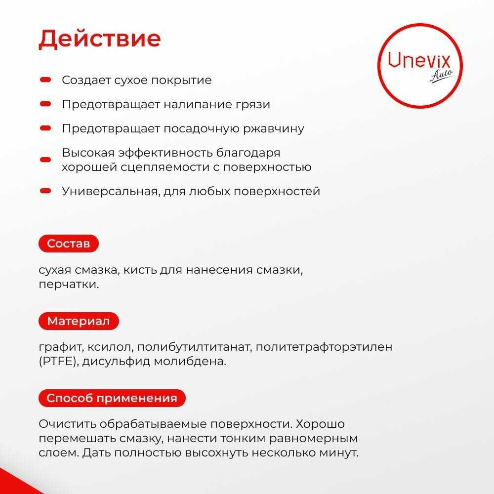 Способ применения : | Очистить обрабатываемые поверхности. Хорошо перемешать смазку, нанести тонким равномерным слоем. Дать полностью высохнуть несколько минут. |
