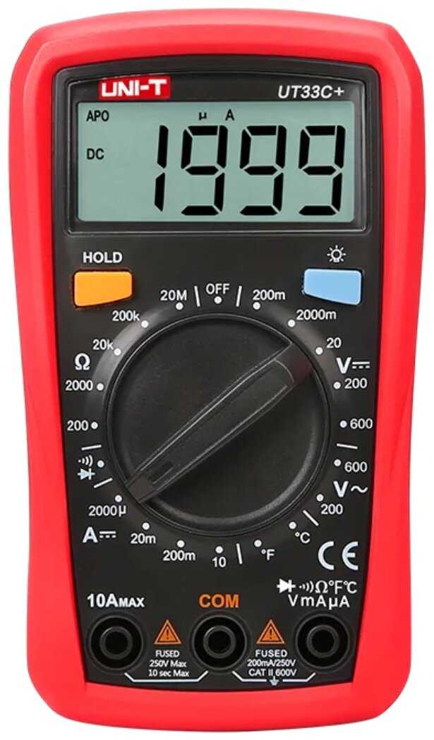 - + Мультиметр UT33C+ зачётный фирменный продукт с гарантией. Функциональный, компактный и удобный, с подставкой, плюс имеет противоударный приятный на ощупь резиновый чехол с креплениями для щупов.