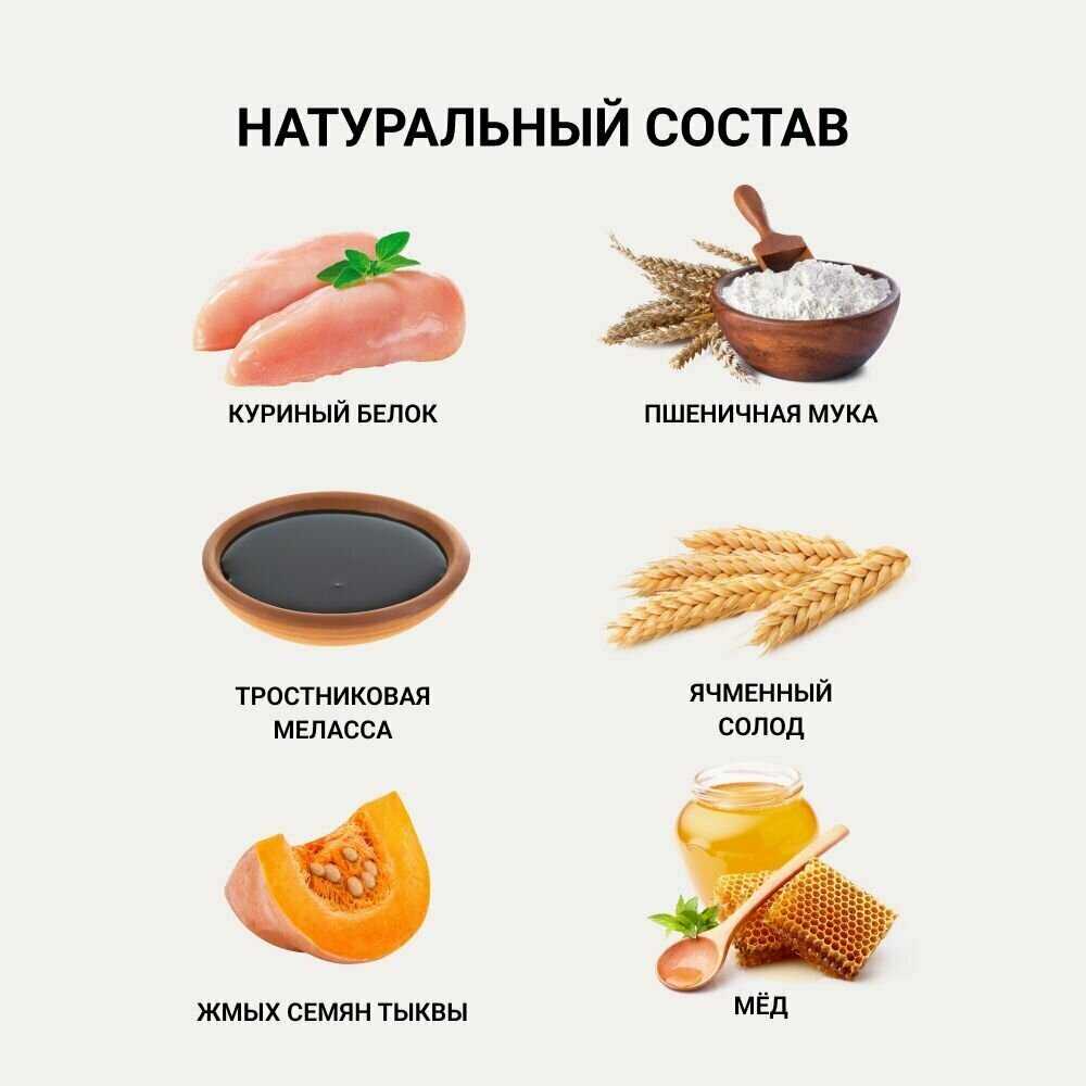 | Состав : | Мука пшеничная, жир куриный, меласса тростниковая, декстроза, дегидрированный куриный белок (4% в коричневой начинке*), ячменный солод, минералы, жмых семян тыквы (0, 5%), мед (0, 024%). *Коричневая начинка обычно составляет 50% продукта. |