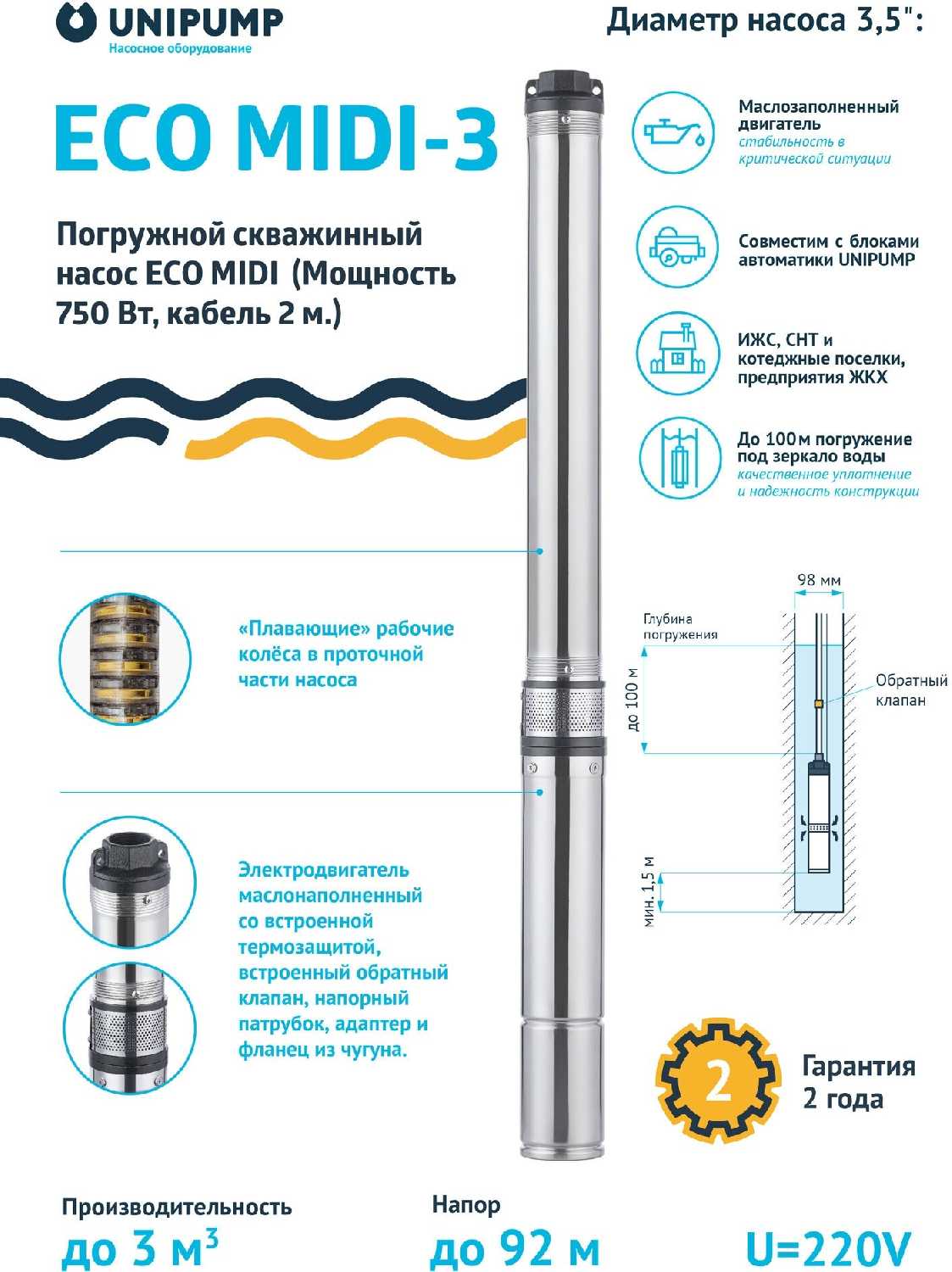 | Подробная комплектация : | Погружной скважинный насос Unipump ECO MIDI - 1 шт. Руководство - 1шт. Упаковка - 1шт. |