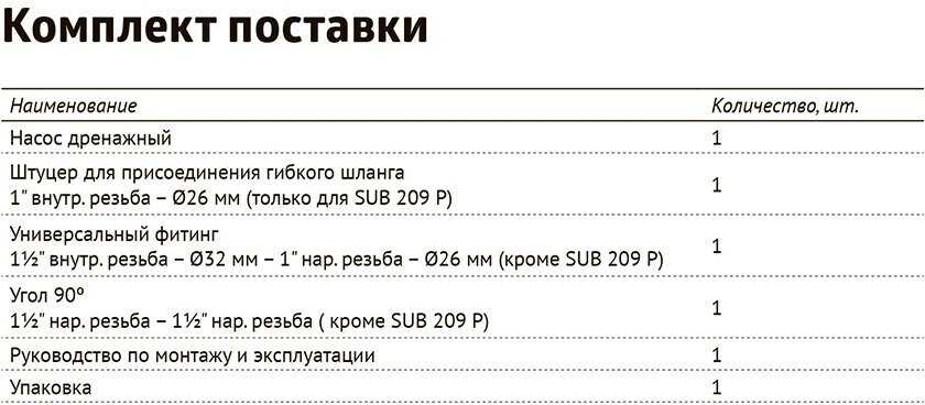 Подробная комплектация : | Насос дренажный — 1 шт., Универсальный фитинг: 11/2" внутр. резьба – Ø32 мм – 1" нар. резьба – Ø26 мм — 1 шт., Угол 90º: 11/2" нар. резьба – 11/2" нар. Резьба — 1 шт., Руководство — 1 шт., Упаковка — 1 шт. |