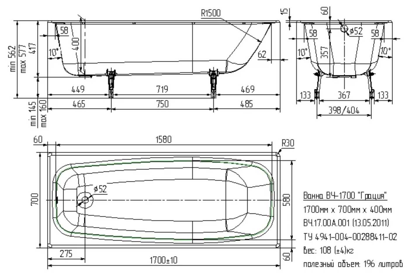 | Дополнительная информация : | ванна поставляется без ножек и без каркаса |