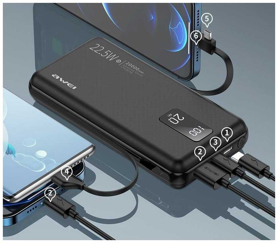 Awei P9K, SCP22.5W / PD20W, 10000 mAh, с встроенным кабелем Type-C/Lightning/micro USB, Черный