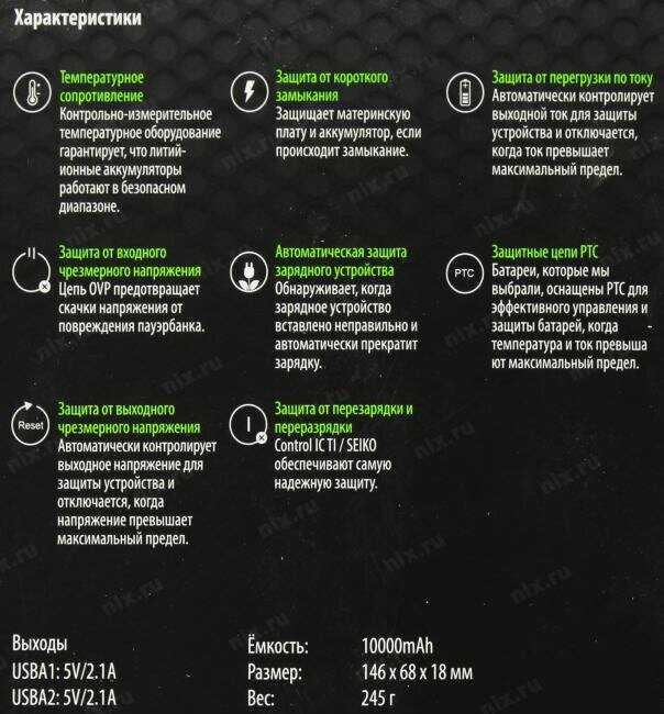 Характеристики:- аккумулятор емкостью 10000 мА⋅ч
