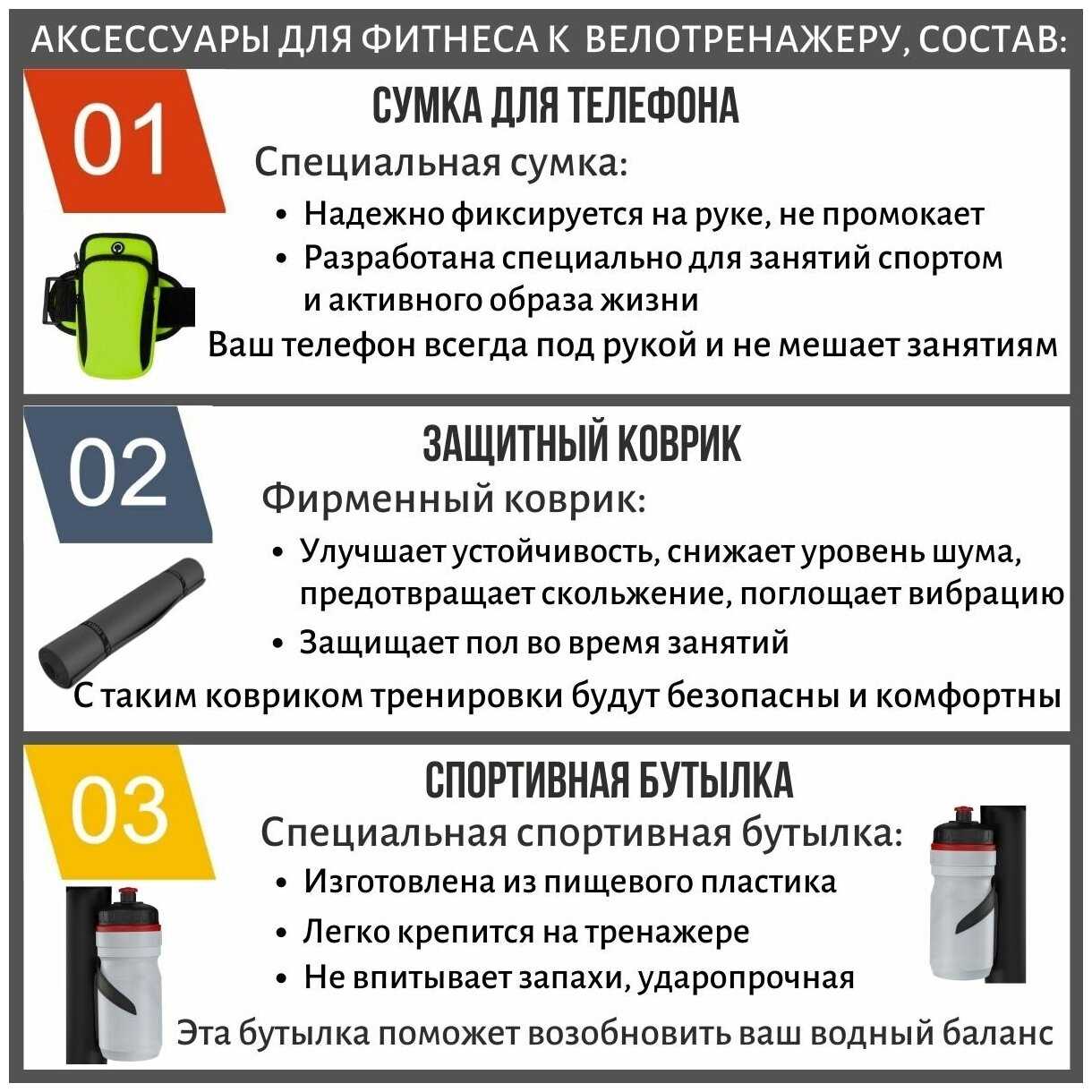 Велотренажер, сумка для телефона с креплением на руку и спортивная бутылка.