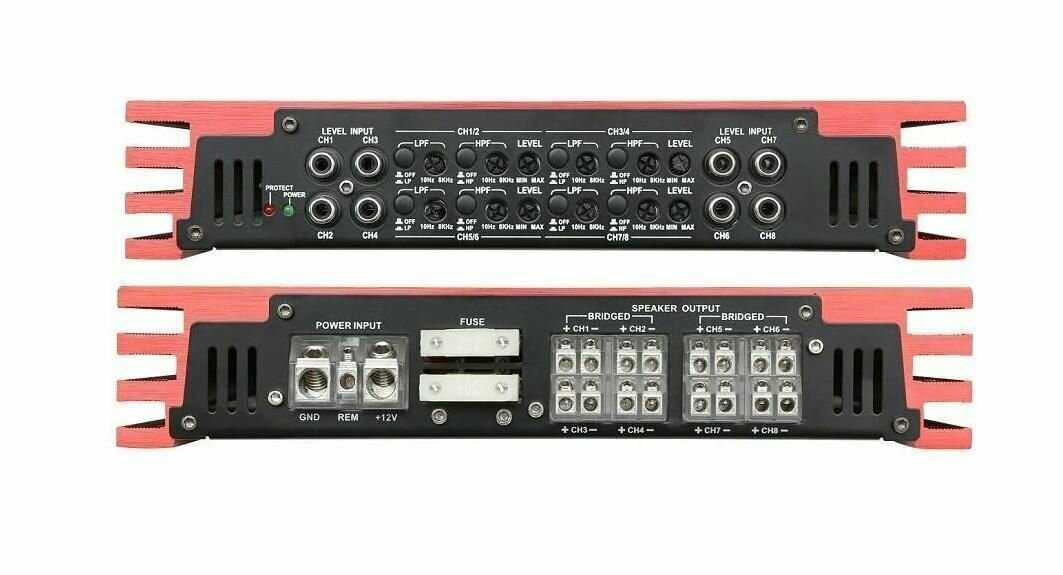 Этот усилитель хорош для фронта, 4 канала используем мостами на мидбасы, а оставшиеся 4 для середины и верха.