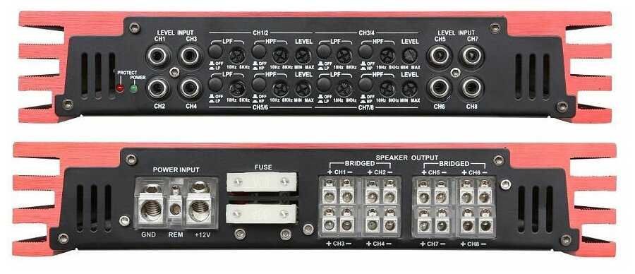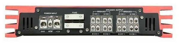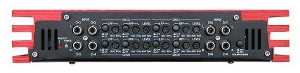 Этот усилитель хорош для фронта, 4 канала используем мостами на мидбасы, а оставшиеся 4 для середины и верха.