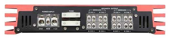 Этот усилитель хорош для фронта, 4 канала используем мостами на мидбасы, а оставшиеся 4 для середины и верха.