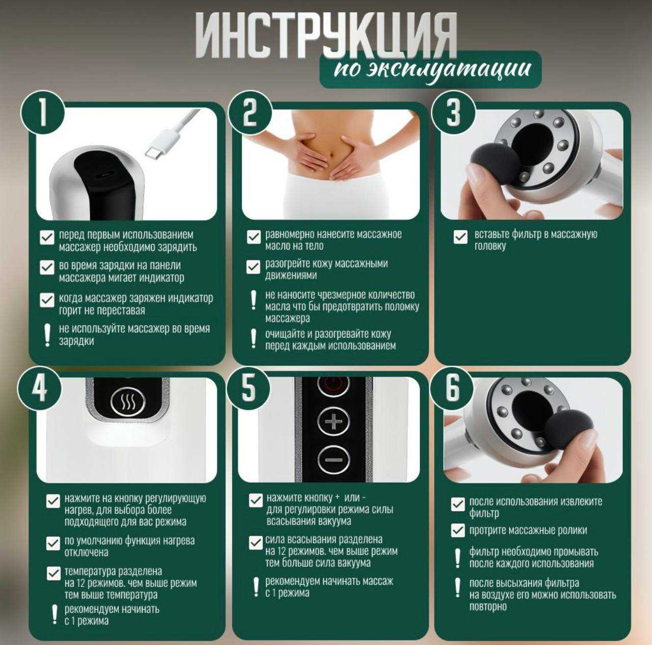 | Подробная комплектация : | вакуумный массажер, сменные фильтры, USB кабель для зарядки, масла |