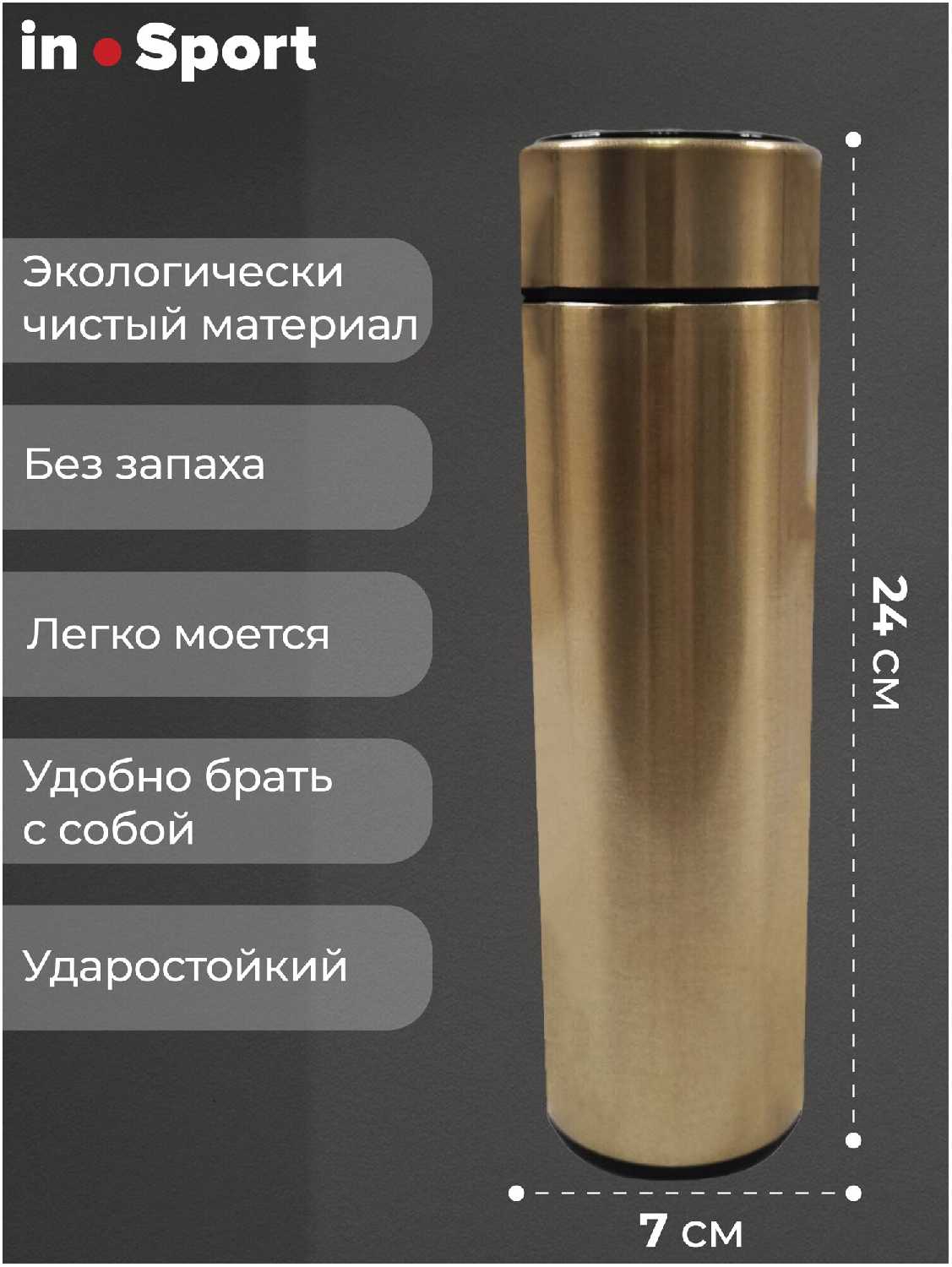 - Узкая цилиндрическая форма и объем 0.43-0.5 л позволяют легко размещать термос в автомобильном подстаканнике, рюкзаке или сумке, не занимая много места.
