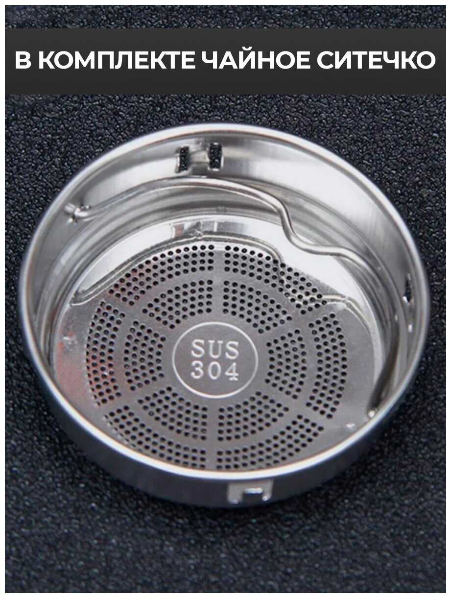 Термос оснащен съемным металлическим ситечком-фильтром, которое пользователи единогласно признают очень удобным и практичным. Оно эффективно задерживает чаинки и даже мелкие частицы заварки, позволяя пить чистый напиток без осадка. Ситечко надежно фиксируется внутри горловины и не выпадает при переноске или наклоне. Эта функция высоко ценится теми, кто регулярно пьет листовой чай или кофе. -