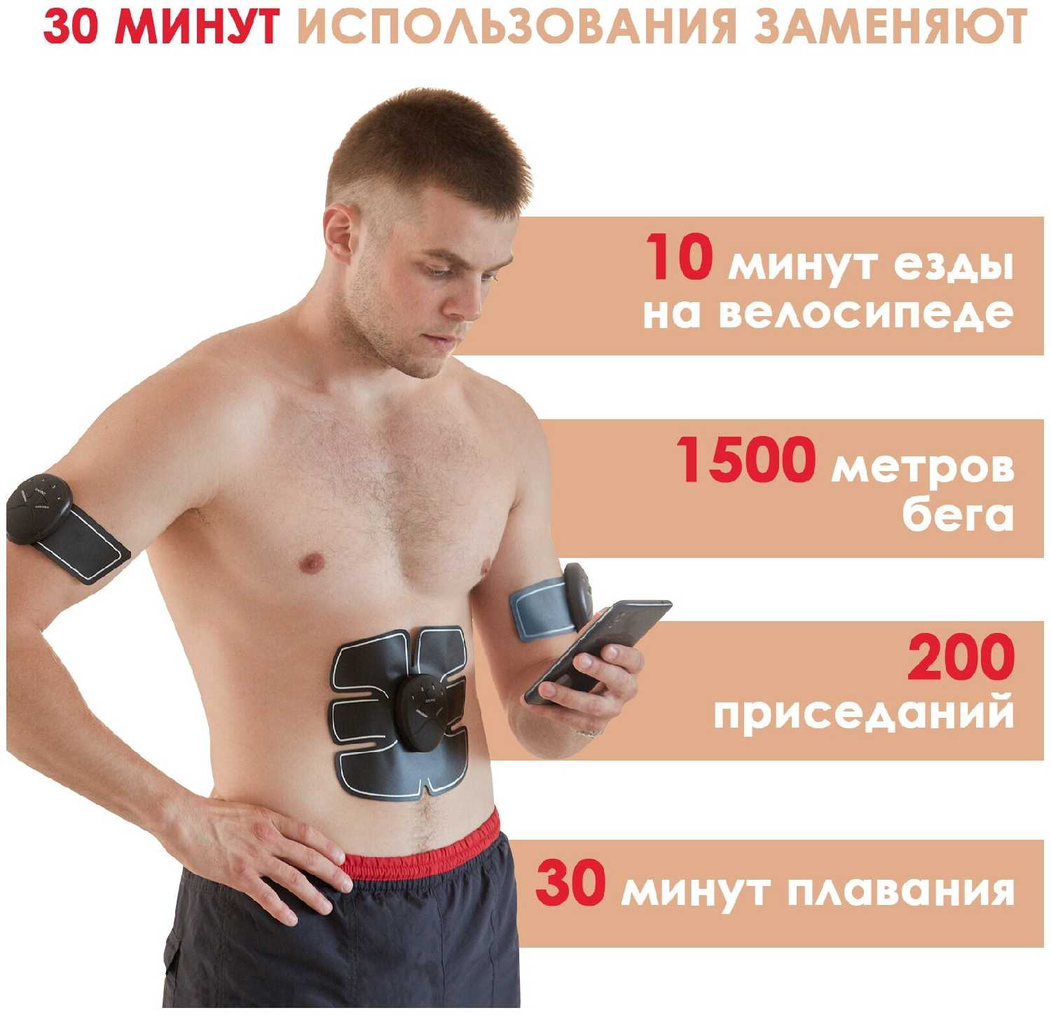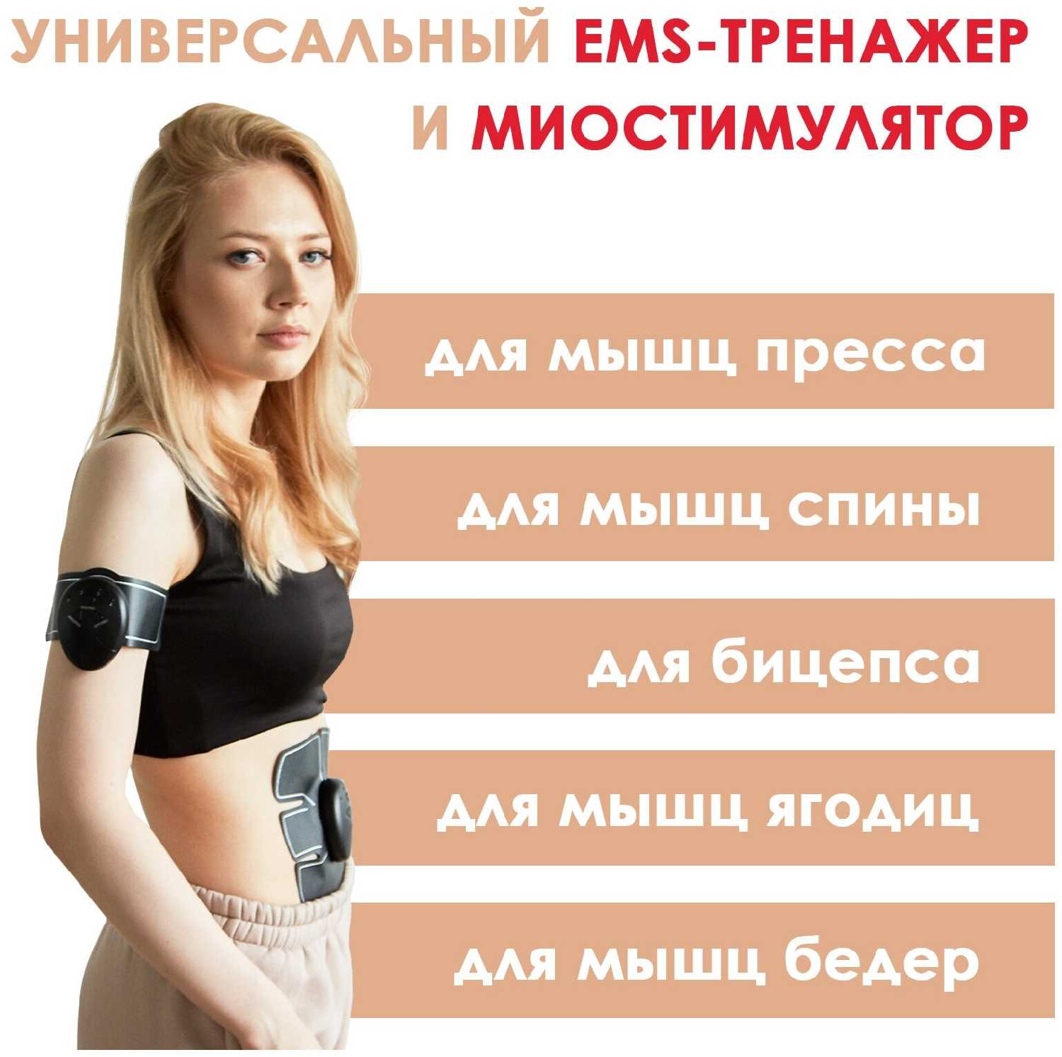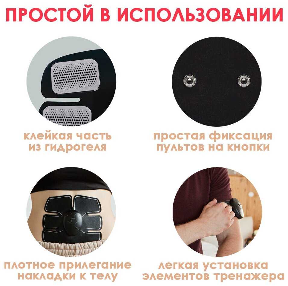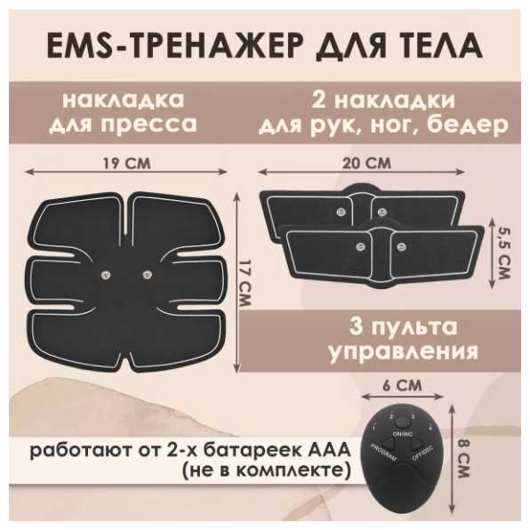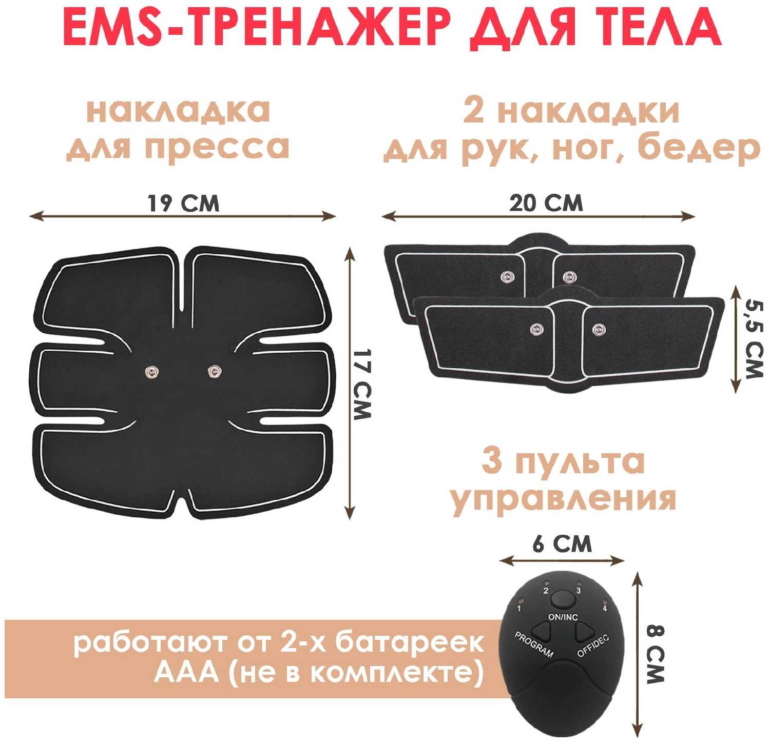Комплектация : | накладка для пресса 19 х 17 см, 2 накладки для рук/ног 20 х 5.5 см, 3 пульта управления |