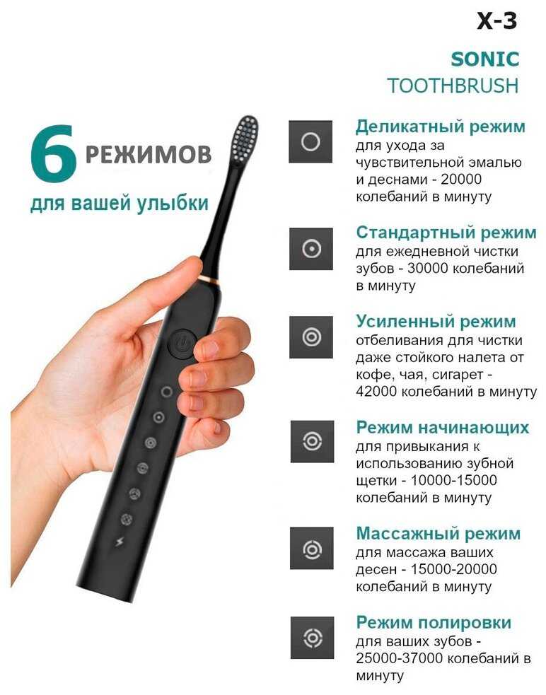 Режимы работы : | деликатная чистка, ежедневная чистка, массаж, отбеливание, полировка, уход за деснами |