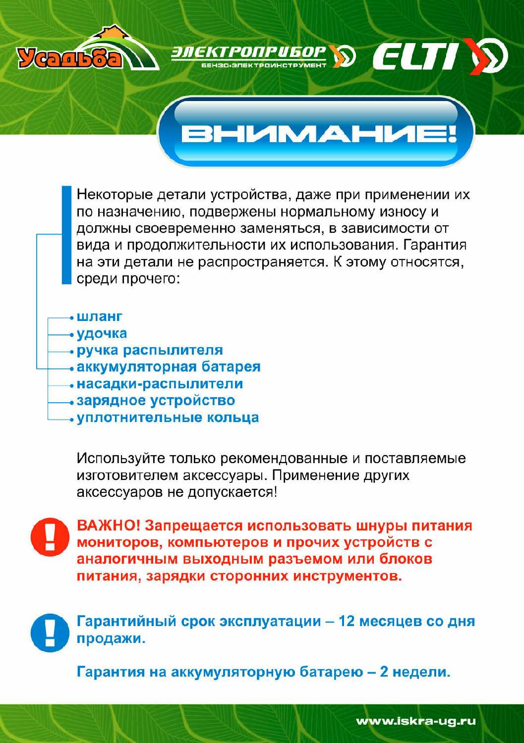 Надежность и долговечность конструкции: Конструкция демонстрирует серьезные проблемы с долговечностью, что подтверждается многочисленными случаями выхода из строя ключевых компонентов. Аккумуляторная батарея является частым источником проблем: отмечаются случаи отгорания клемм из-за слабого заводского обжима, что является производственным браком. Насосная система подвержена коррозии и заклиниванию, особенно при использовании химических растворов для обработки растений, что указывает на несоответствие материалов агрессивным средам. Герметичность соединений со временем нарушается, приводя к протечкам в области насоса и разъемных соединений шлангов, что не только снижает эффективность, но и создает риск попадания химикатов на пользователя. Пластиковые компоненты, такие как трубка с насадкой, критикуются за хрупкость и склонность к растрескиванию, что требует частого ремонта или замены. Жесткий подающий шланг из ПВХ не становится мягче при эксплуатации, что осложняет маневренность, а его специфические концевые соединения затрудняют замену на альтернативные варианты. Общая оценка надежности пользователями низкая, многие отмечают, что устройство эффективно работает лишь первые 2-3 месяца сезона, после чего начинает стремительно деградировать, требуя постоянного вмешательства и ремонта. Эксплуатационная надежность сильно зависит от условий хранения; пользователи, хранившие устройство в тепле, отмечали его исправную работу в течение двух сезонов, в то время как пренебрежение этим правилом приводило к отказам. Механизм крепления ремней и лямок выполнен неудобно и ненадежно: нижние крепления имеют склонность соскакивать при надевании ранца на спину, а сама система ремней часто оценивается как не продуманная эргономически. Некоторые пользователи столкнулись с некомплектностью поставки, в частности, с отсутствием креплений для ремней или одного из распылителей, что требовало дополнительных обращений к продавцу. Сборка отдельных узлов, таких как телескопическая штанга, также вызвала нарекания из-за недостаточной жесткости фиксации и самопроизвольного выскакивания при работе, что потребовало от пользователей дополнительной доработки. Зарядное устройство вызывает вопросы о качестве: его пластиковый корпус быстро нагревается во время заряда, а короткие провода и неинформативная индикация (светодиоды) осложняют процесс контроля состояния аккумулятора. В целом, устройство позиционируется пользователями как продукт с нестабильным качеством сборки, где удачные экземпляры могут прослужить несколько сезонов при бережной эксплуатации, но значительная доля изделий имеет заводской брак, leading к преждевременному выходу из строя. Рекомендации по применению включают обязательную проверку комплектности и работоспособности при получении, использование защитных перчаток из-за риска протечек химикатов, а также хранение в отапливаемом помещении в межсезонный период для сохранения работоспособности аккумулятора и насосного узла. Для продления срока службы пользователи советуют избегать длительных простоев с химическими растворами внутри бака, немедленно промывая систему чистой водой после использования, а также самостоятельно подтягивать все разъемные соединения и электрические клеммы перед началом сез