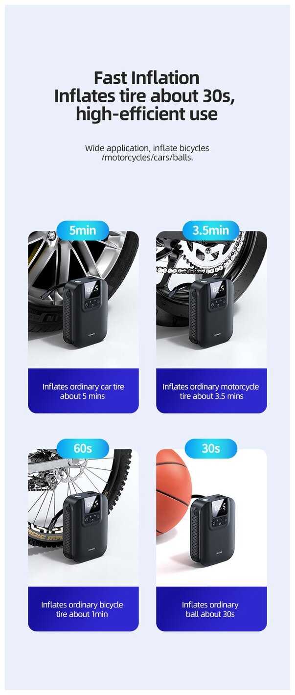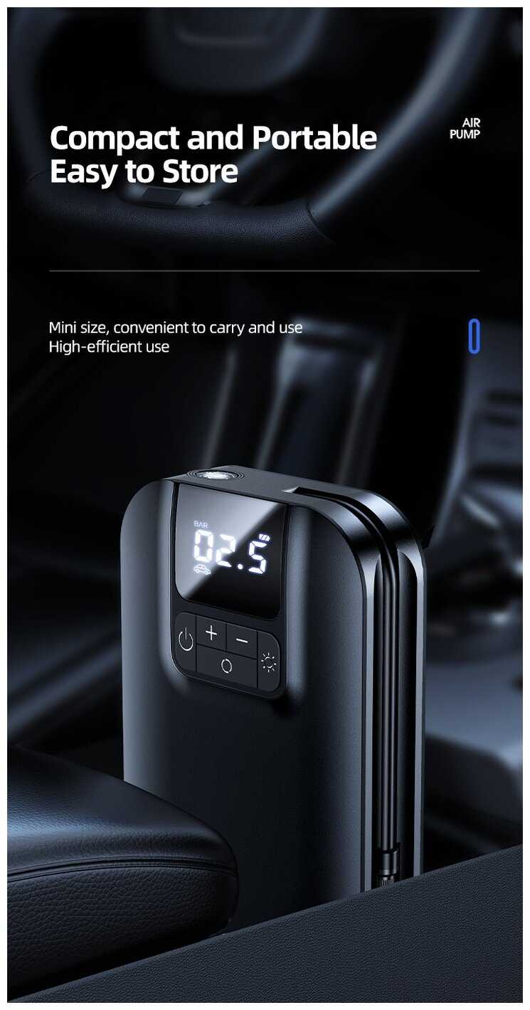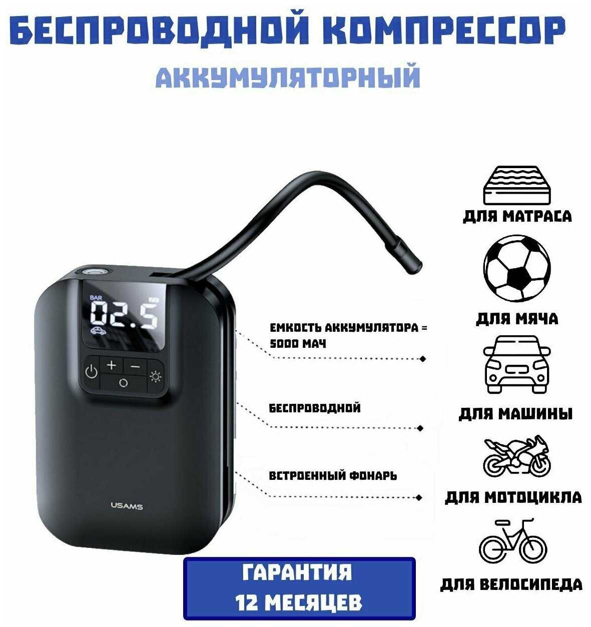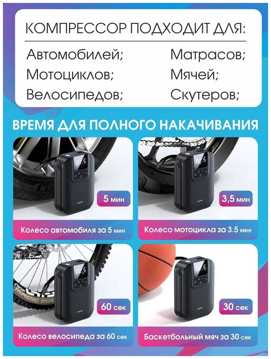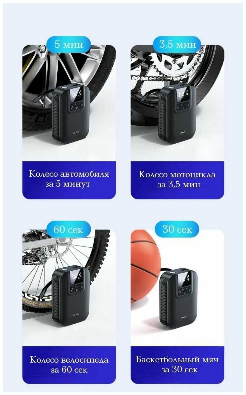 - + Очень удобно накачивать колеса на велосипедах, на авто не пробовал но думаю справится, не надо никаких прикуривателя, заряжается как обычный телефон.