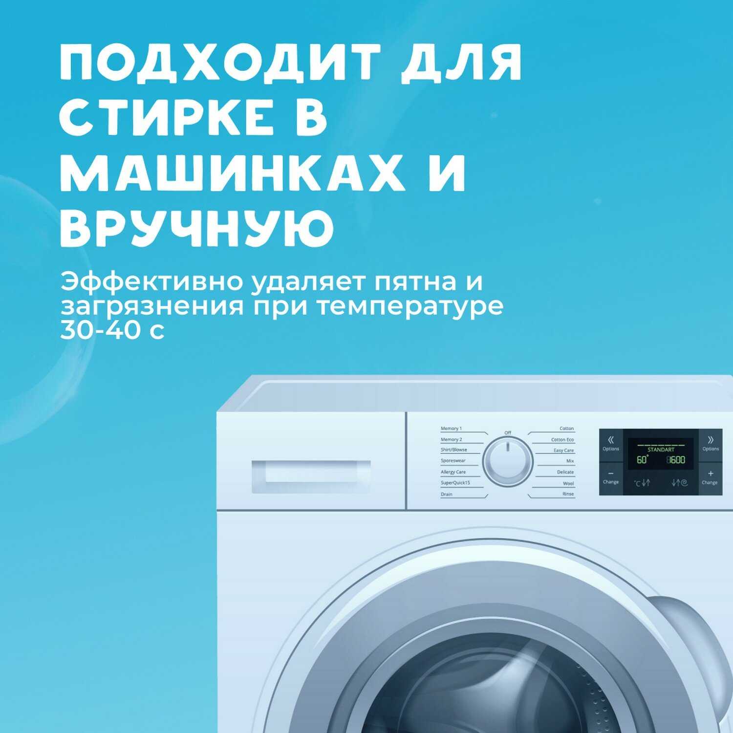 - Эффективно работает при низких температурах (30–40°C), подходит для деликатных, синтетических и шерстяных тканей.