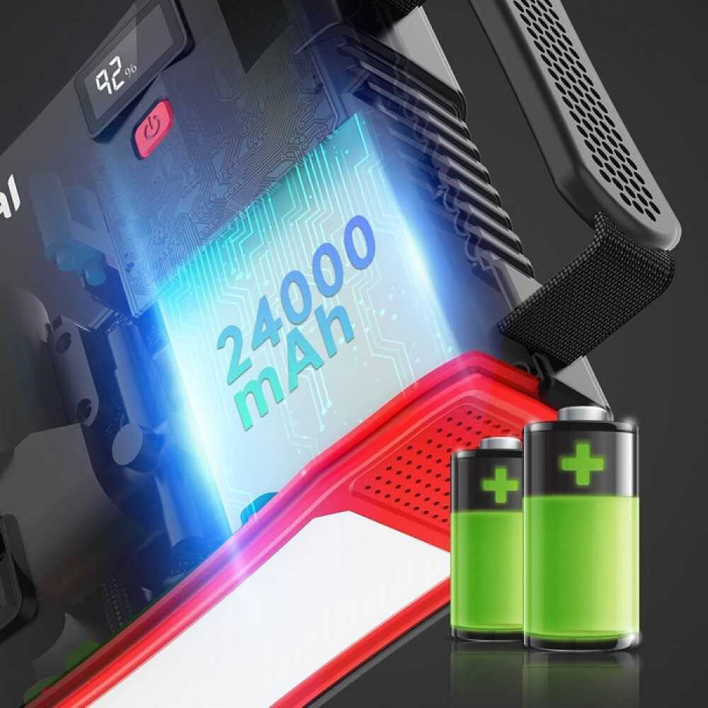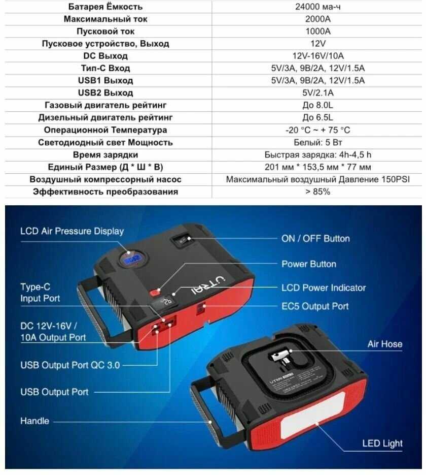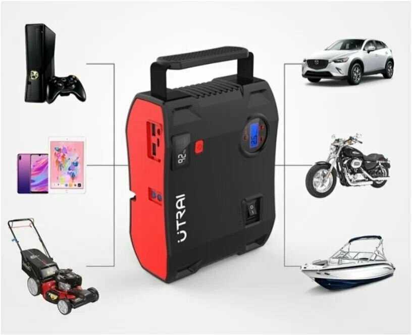- + Многофункциональное: фонарик, зарядка доя ноута и телефона, компрессор для накачивания шин до заданного давления. Есть переходники для мячей. Ну и бустер