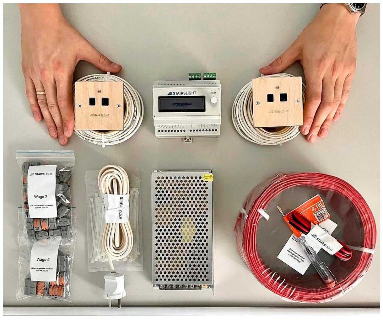 - Контроллер для управления подсветкой лестницы (подключение до 18-ти ступеней) - 1 шт. Датчик движения со встроенным датчиком света 75x75 мм - 2 шт. Кабель экранированный - 2 шт. по 10 метров