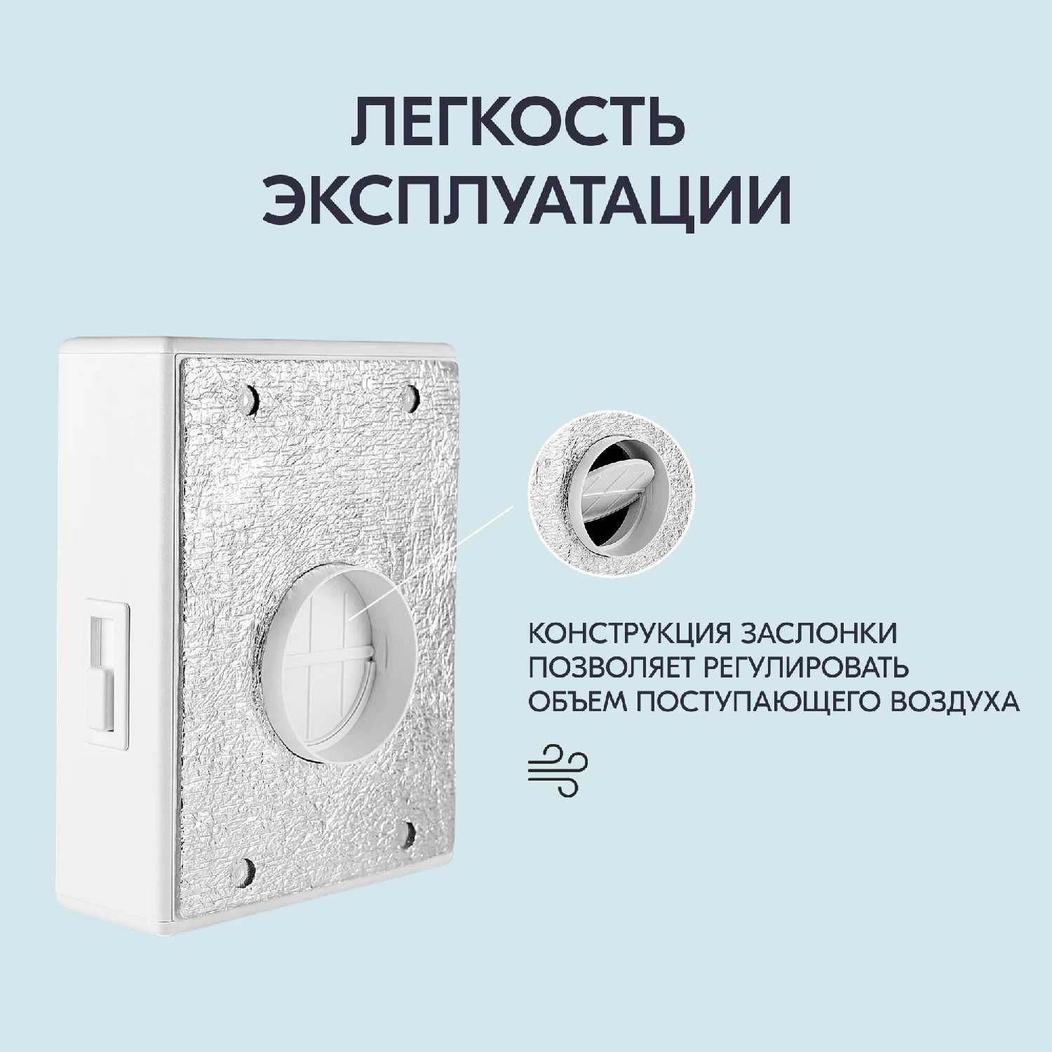 Клапан отличается добротным изготовлением: матовый белый пластик, металлические элементы внутреннего механизма, качественная сборка, обеспечивающая полную герметичность в закрытом состоянии. Монтаж на готовое отверстие стандартного диаметра (125-132 мм) прост и может быть выполнен самостоятельно с помощью 4 саморезов, особенно если он производится вместо старого КИВа от застройщика. Ключевым требованием для обеспечения герметичности является идеально ровная поверхность стены в месте примыкания корпуса; на неровных стенах (например, с незначительными изгибами) через щели может поддувать холодный воздух, что потребует дополнительной герметизации поролоном или монтажа на выравнивающую фанерную пластину. К недостаткам эргономики относится управление заслонкой: регулировочный ползунок часто бывает тугым, требует приложения значительного усилия и работы двумя руками, особенно при боковом расположении клапана. Для пожилых людей или при высоком расположении устройства (под потолком) регулировка становится неудобной или вовсе невозможной без использования стремянки, что вынуждает пользователей самостоятельно изготавливать и устанавливать удлиненные ручки. Габариты устройства довольно крупные, что, с одной стороны, улучшает шумоподавление, а с другой — усложняет его интеграцию в интерьер и может создавать помехи (например, при монтаже вплотную к натяжному потолку).