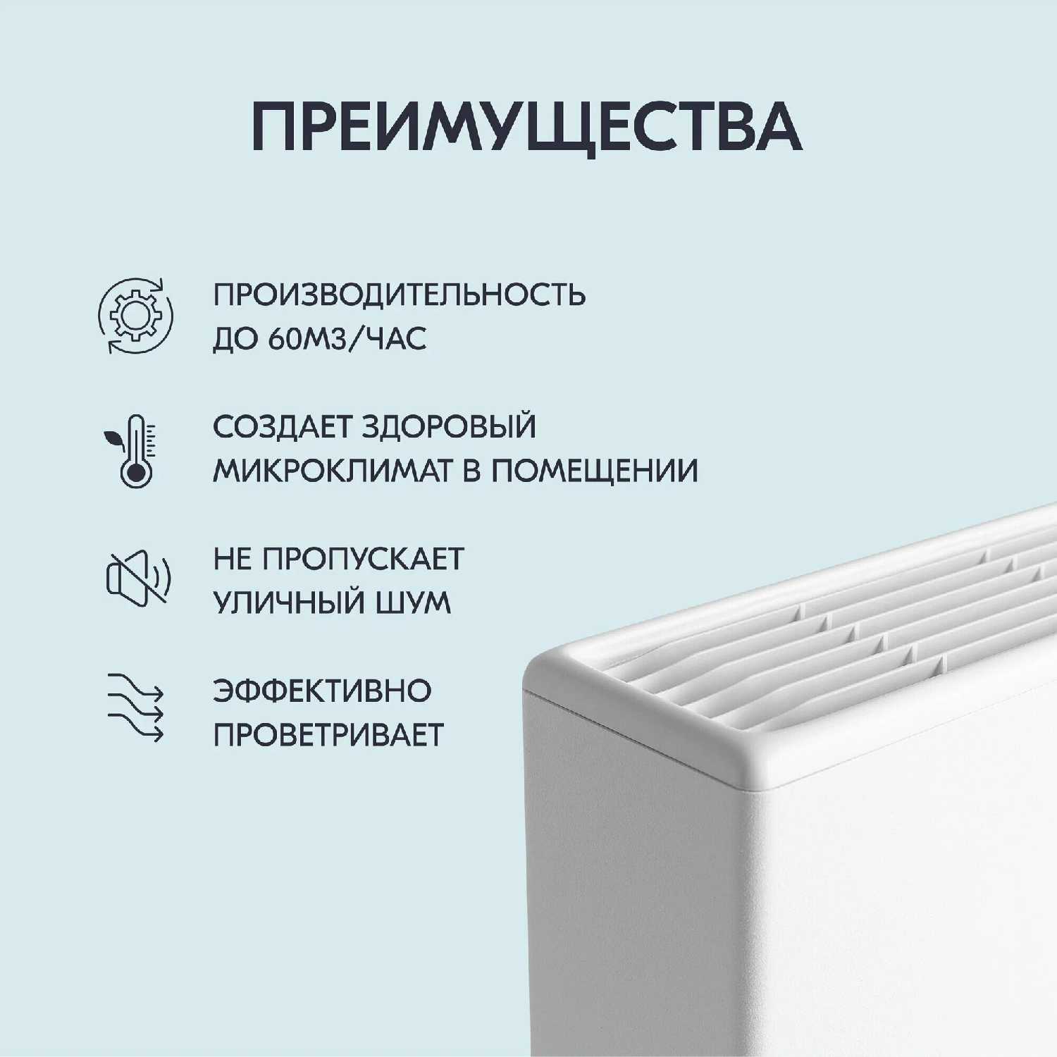 Производительности одного клапана достаточно для обеспечения притока свежего воздуха в помещение площадью до 40 м² при условии исправной работы штатной вытяжной вентиляции. Эффективность работы напрямую зависит от разницы температур внутри и снаружи: зимой тяга максимальна, а летом, при сближении температур, приток воздуха значительно ослабевает и может потребоваться принудительная вытяжка для создания потока. -
