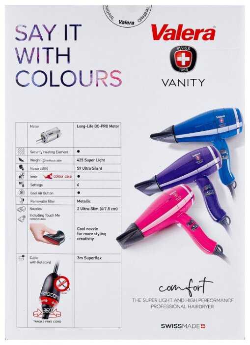 Данная серия - vanity, ко всем плюсам стандартных моделей, имеет яркий дизайн, обладает пониженным шумообразованием (до 20 децебел тише) и немного легче, чем стандартный фен valera rotocord.