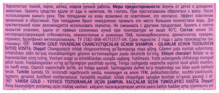| Подробная комплектация : | Vanish Gold Шампунь для ковров и для моющих пылесосов, 450 мл |