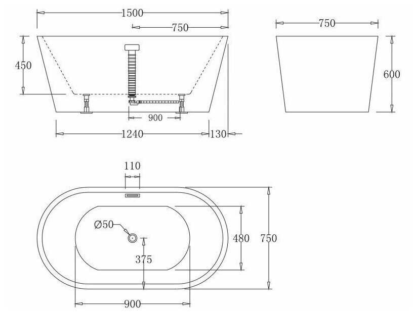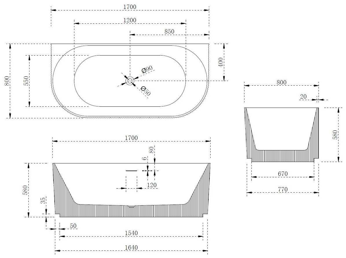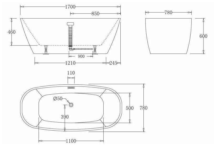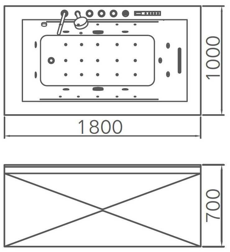 - подробная комплектация: Расположение перелива: переливное и сливное отверстие посередине низкой короткой стороне ванны