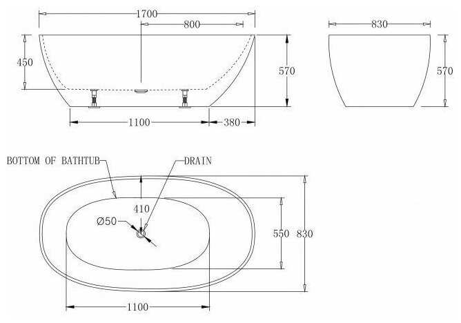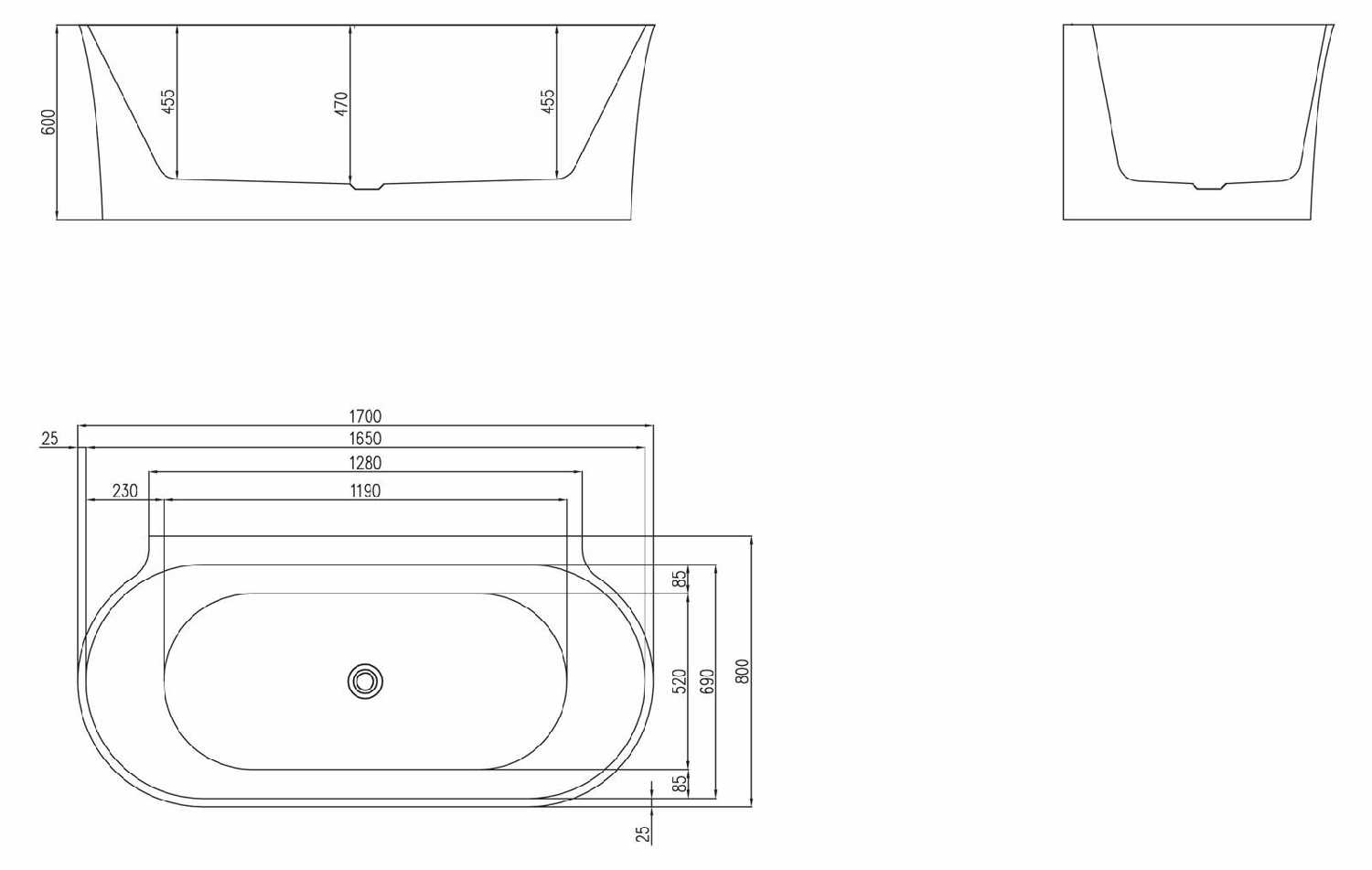 - подробная комплектация: Расположение перелива: переливное и сливное отверстие посередине низкой короткой стороне ванны