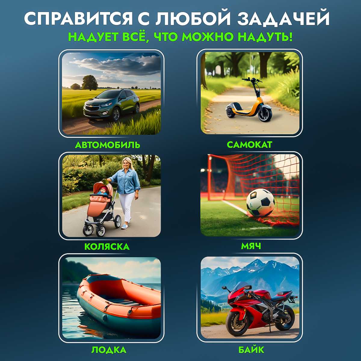 | В наборе : | комплект насадок, переходник для велосипедных шин, переходник для мячей, сумка для хранения, фонарь |
