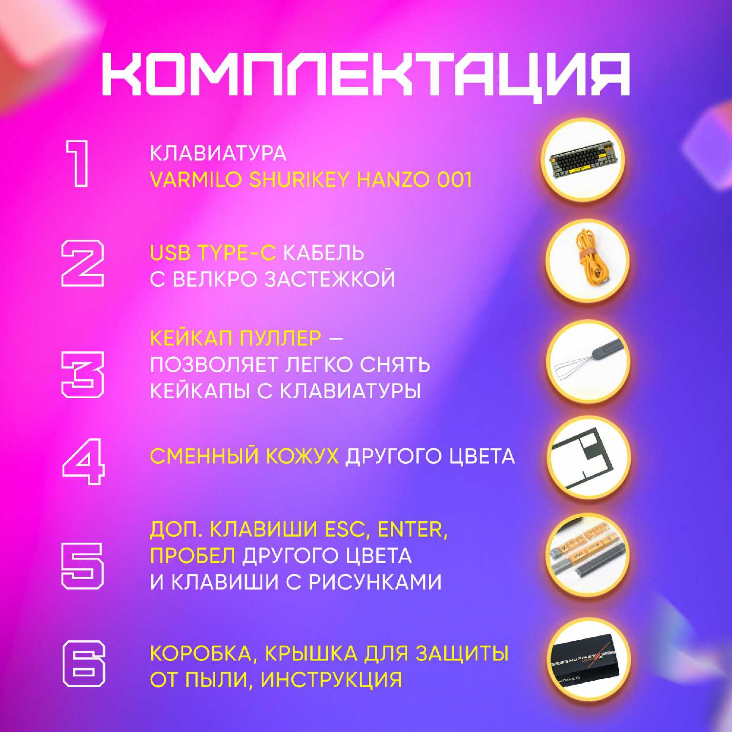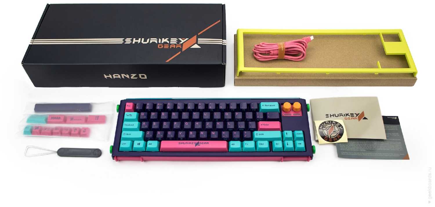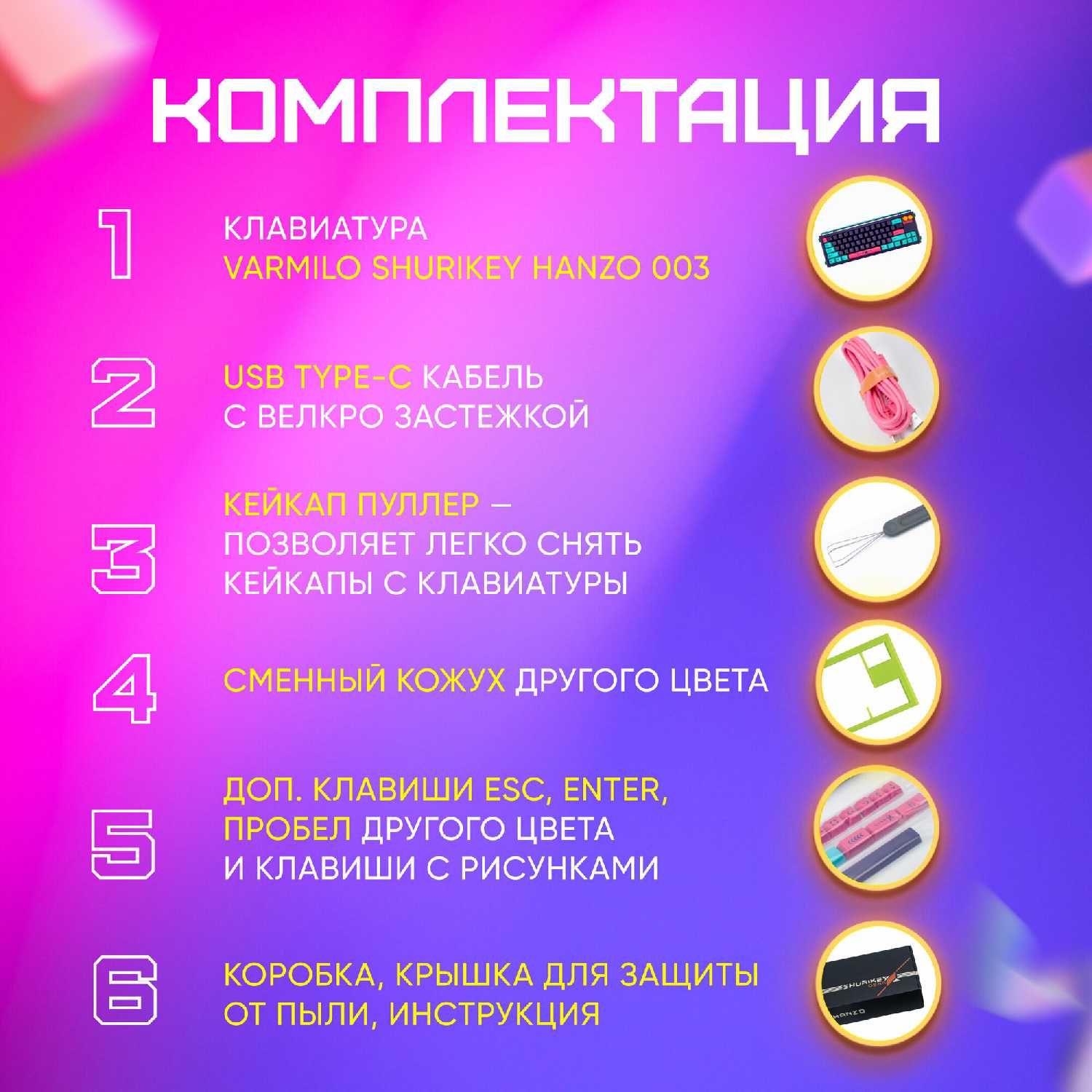 Комплектация : | Клавиатура, Коробка, Крышка для защиты от пыли, Сменный кожух другого цвета, Кейкап пуллер — позволит легко снять кейкапы с клавиатуры, USB Type-C кабель с велкро застежкой, Инструкция на английском языке, Дополнительные клавиши ESC Enter Пробел другого цвета и клавиши с рисунками. |