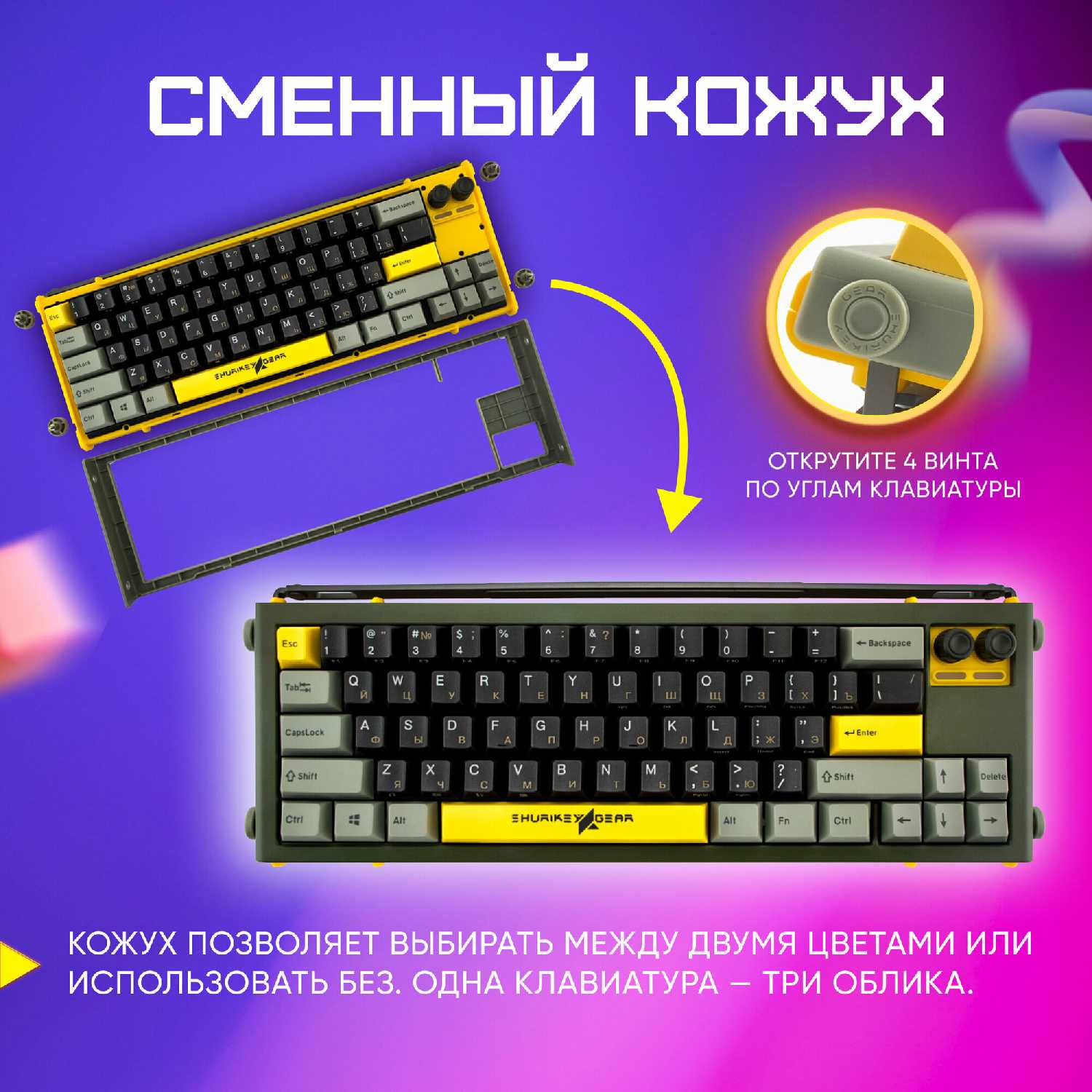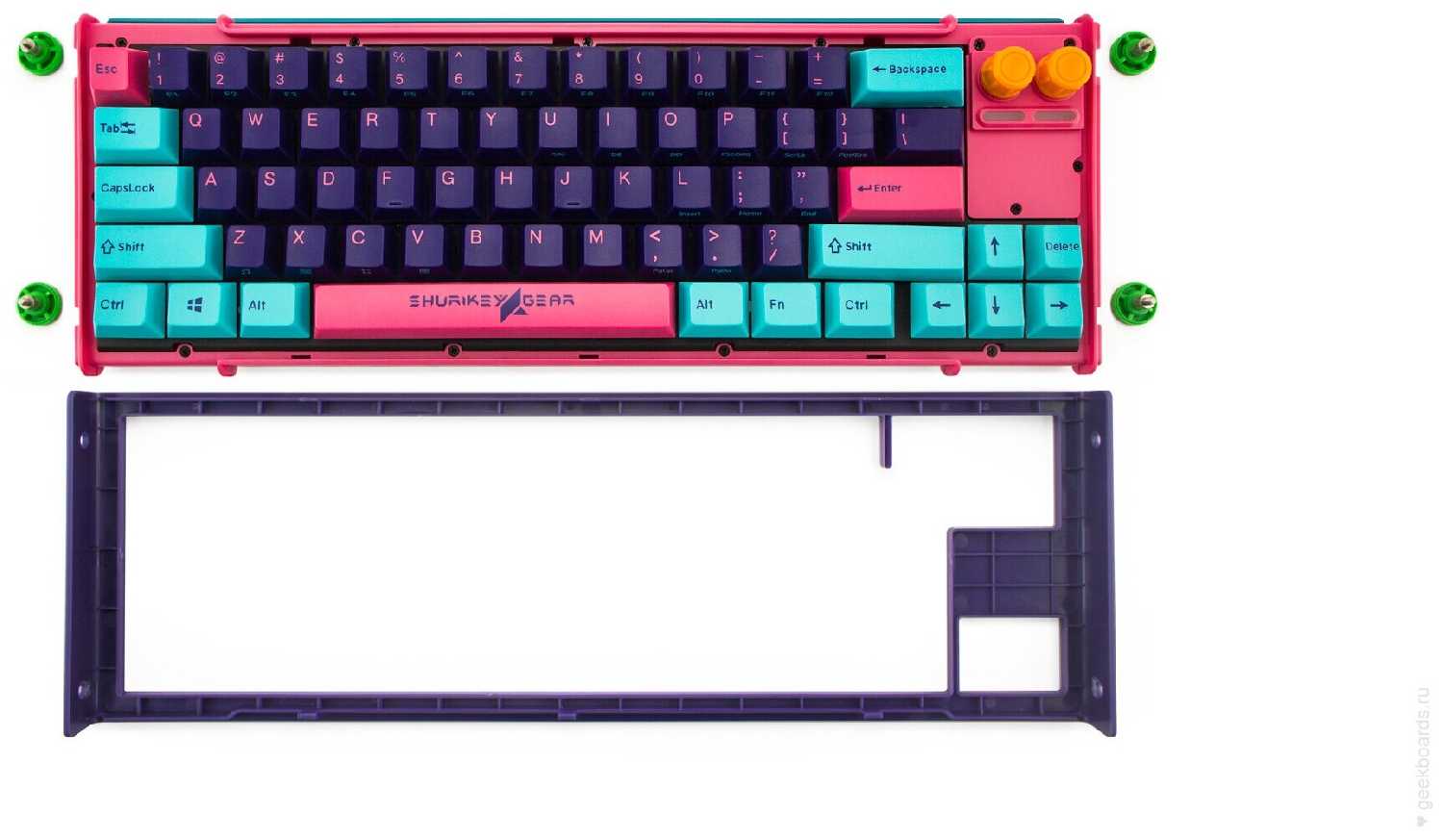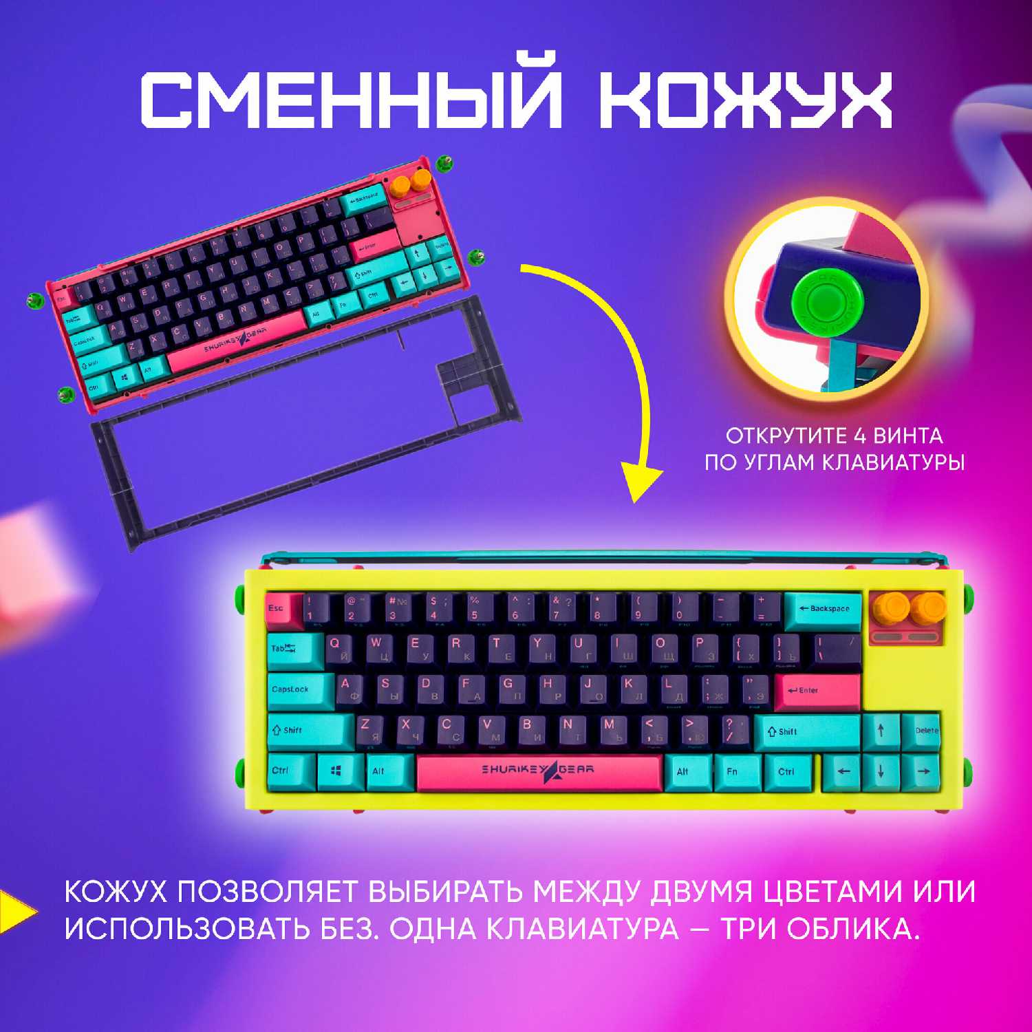 Комплектация : | Клавиатура, Коробка, Крышка для защиты от пыли, Сменный кожух другого цвета, Кейкап пуллер — позволит легко снять кейкапы с клавиатуры, USB Type-C кабель с велкро застежкой, Инструкция на английском языке, Дополнительные клавиши ESC Enter Пробел другого цвета и клавиши с рисунками. |