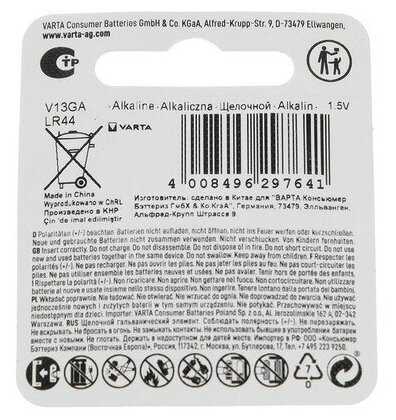 | Типоразмер : | LR44 (LR1154, V13GA, AG13, G13, RW82), SR44 (303, 357, SR44SW) |