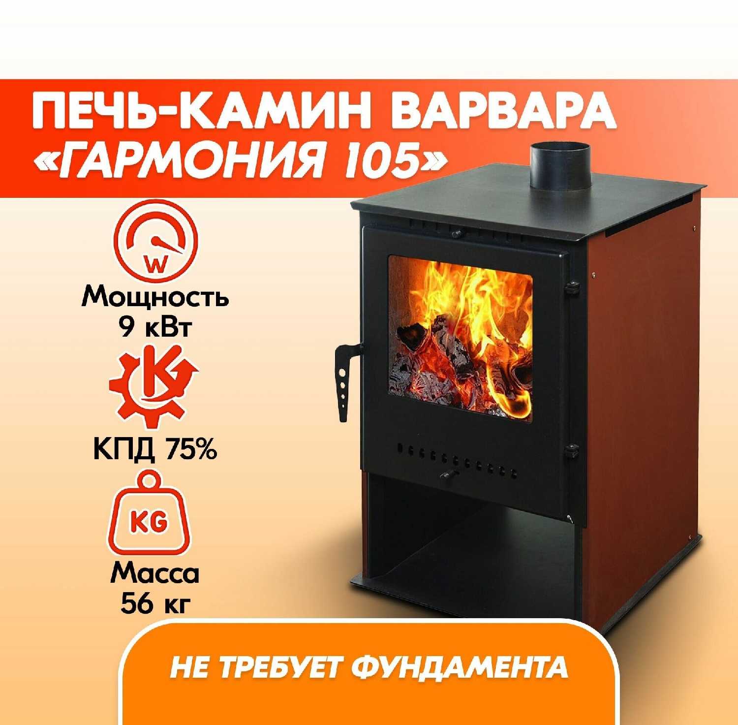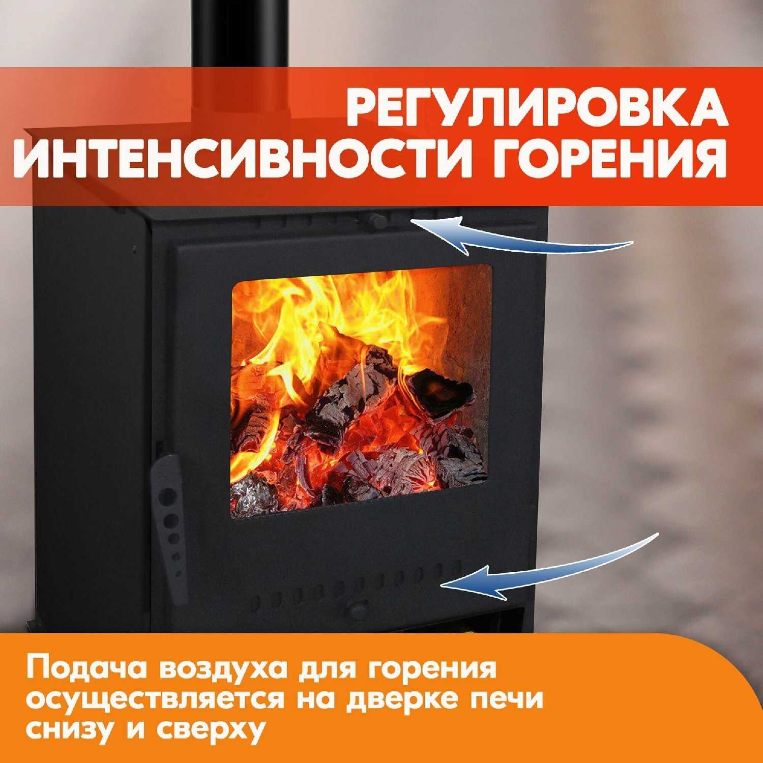 - + Очень быстро прогревает помещение. Хорошая теплоотдача. Очень удобный зольник и регуляторы подачи воздуха.